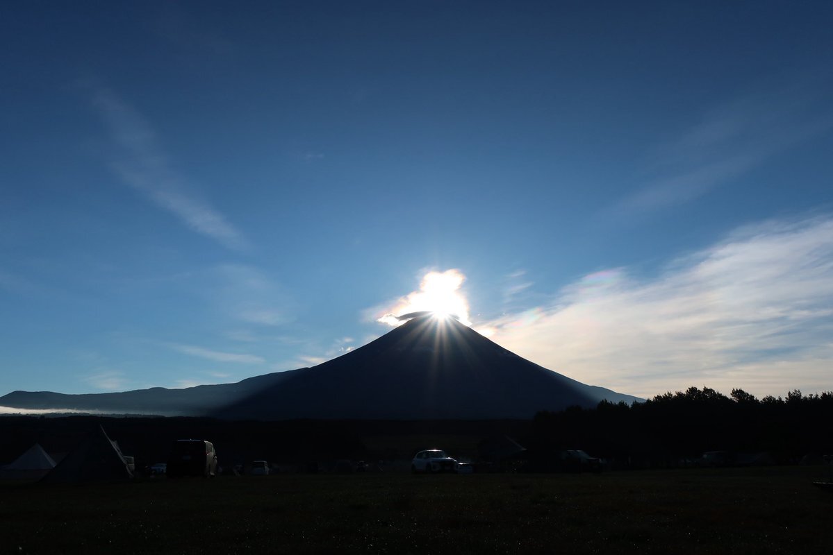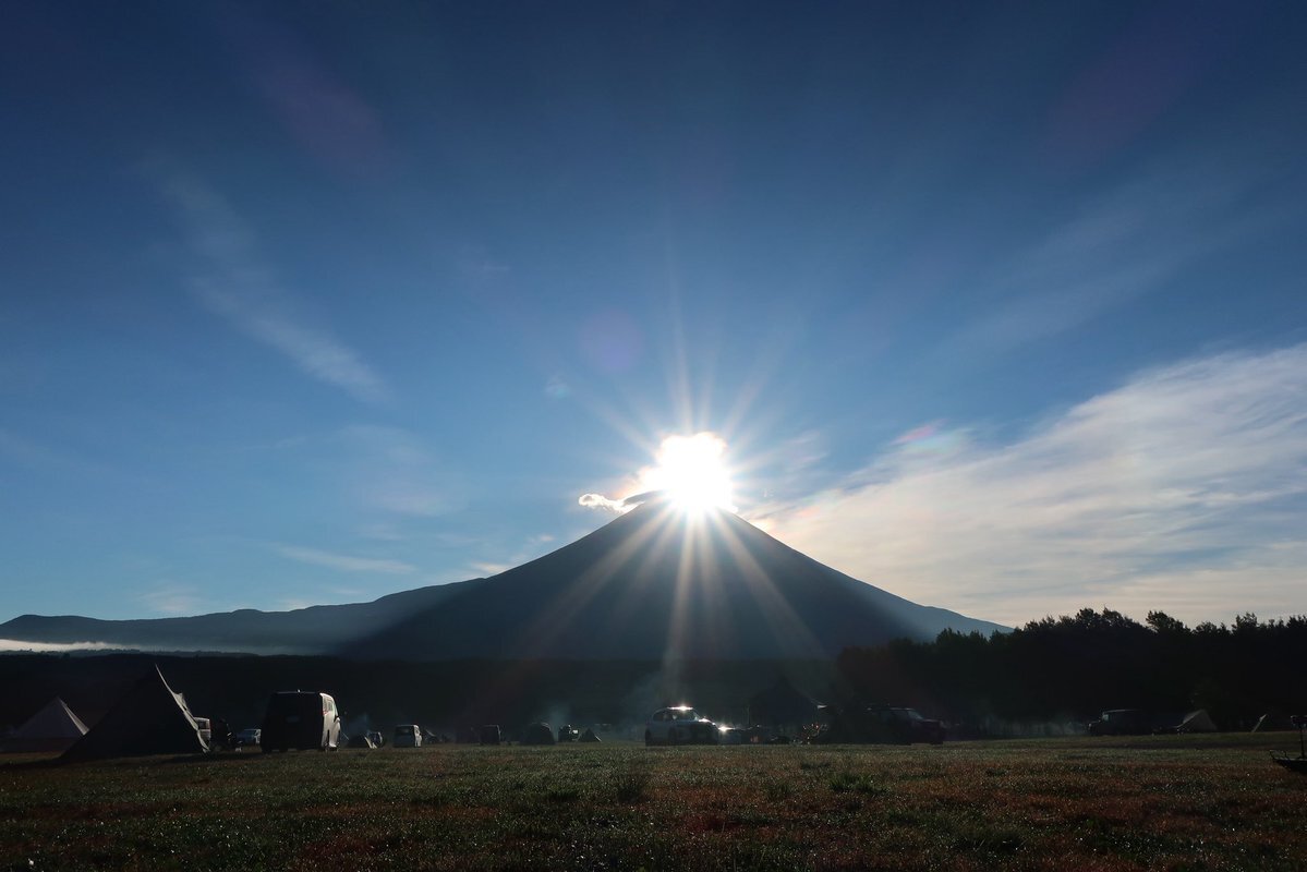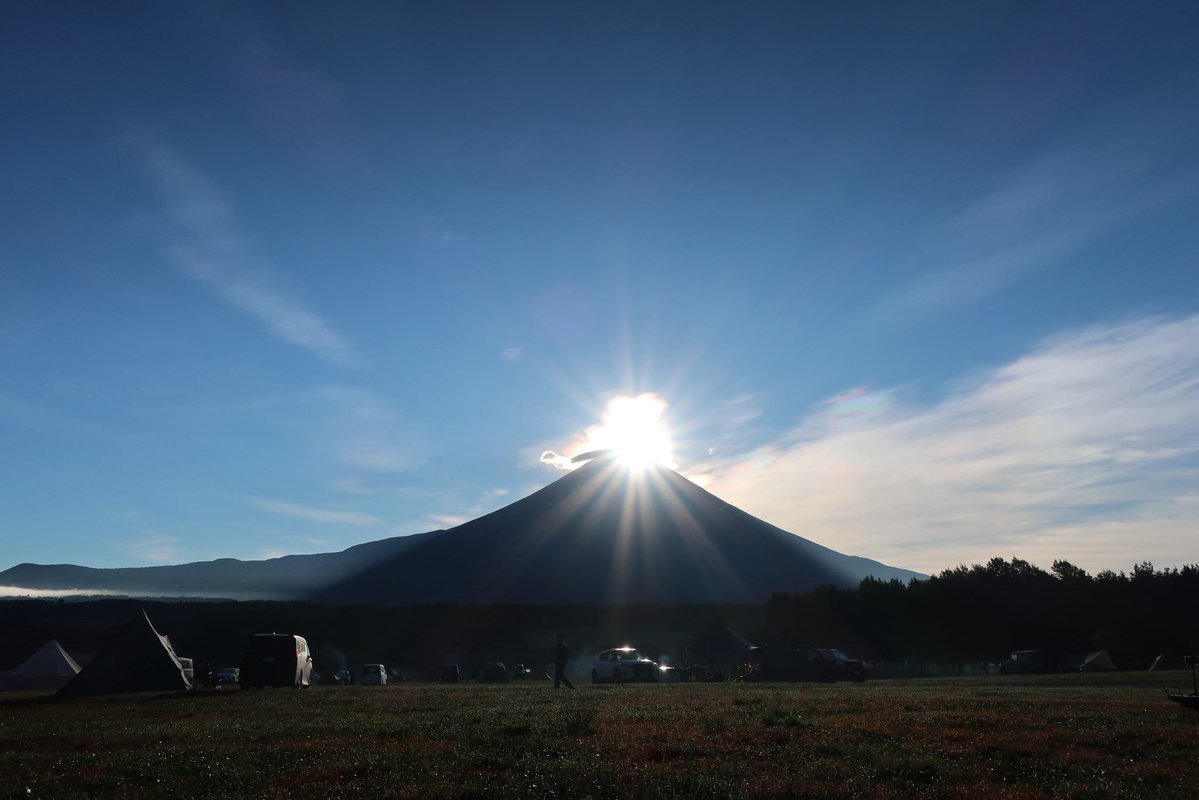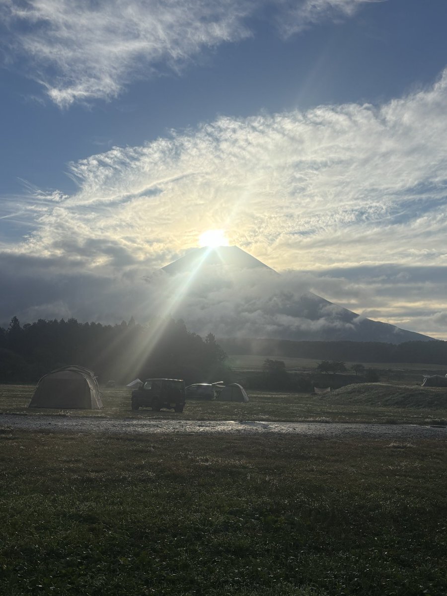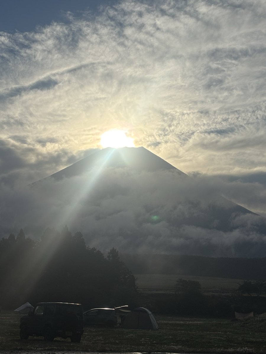 5:30 ごろは曇っていて今日はダメか~😫とあきらめ ➡ からの ➡ 奇跡的に富士山がお目見えしてくれました~🥰 #ダイヤモンド富士 #富士山 #ふもとっぱら pic.x.com/QQIyEYMlk9