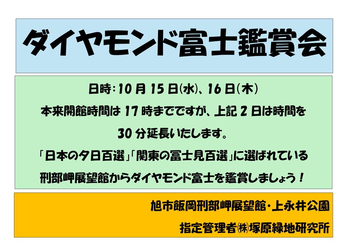 「日本の夕日百選」「関東の冨士見百選」に選ばれている刑部岬展望館のダイヤモンド富士を皆様に楽しんでいただくためダイヤモンド富士鑑賞会として 10月15日(水)、16日(木)に開館時間を30分延長いたします。 ふるってご来館ください。 #刑部岬 #あったか旭 #ダイヤモンド富士 pic.x.com/KNk5VtZpIc