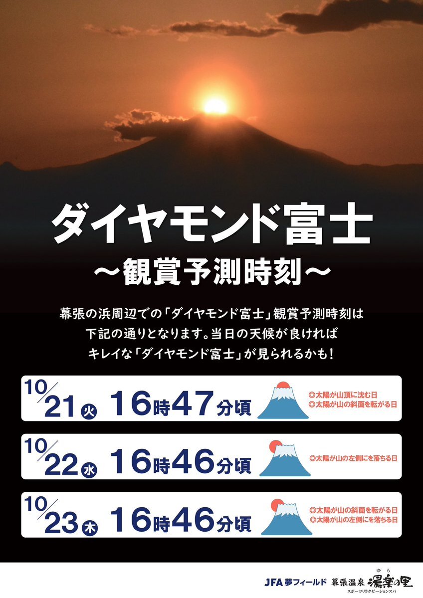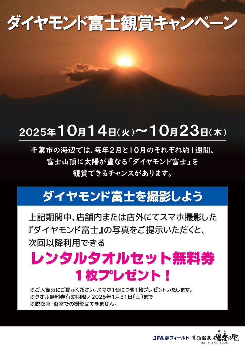 幕張温泉湯楽の里です♪ 本日からダイヤモンド富士鑑賞キャンペーンが 始まります✨ ダイヤモンド富士を撮影したらフロントへ💁🏻 従業員に写真をお見せ頂き確認出来たら レンタルタオルセット無料券を1枚 プレゼント致します🎁 #幕張温泉湯楽の里 #ダイヤモンド富士 pic.x.com/bIvg3QFyzW