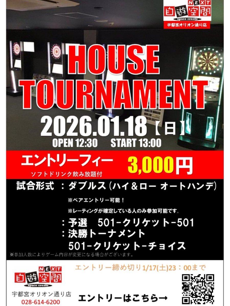 【イベント情報🌟】 2026.01.18(日)にハウストーナメント開催決定🎯✨ 絶賛エントリー受付中です❗️ ダーツライブのレーティングが確定している方ならどなたでも参加OK👌沢山のご参加お待ちしております😄 #ダーツ #自遊空間 #オリオン通り エントリーはこちら↓ docs.google.com/forms/d/e/1FAI… pic.x.com/CdAcqomicR