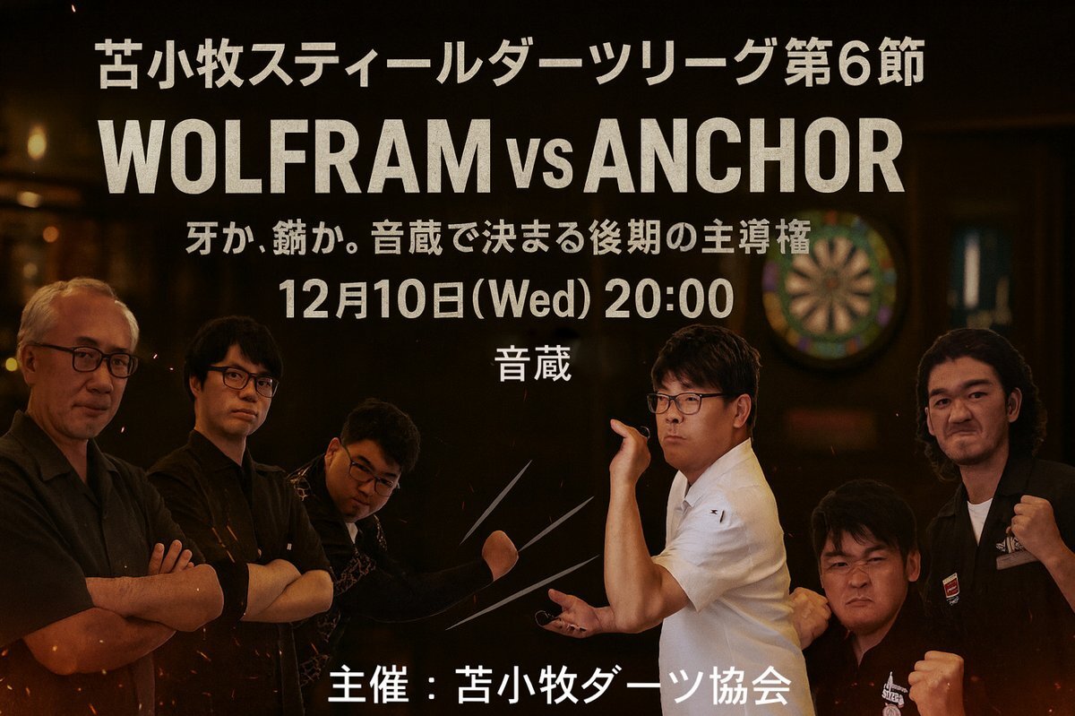 2025年度 スティールダーツリーグ 後期 第6節 牙か、碇か。音蔵で決まる後期の主導権 12月10日(水)20:00 WOLFRAM vs ANCHOR 会場:音蔵 見学者大歓迎 ライブスコアはこちらで観れます n01darts.com/n01/league/sea… #ダーツ #スティールダーツ #ハードダーツ #苫小牧 #音蔵 pic.x.com/LoxGkhgzeb