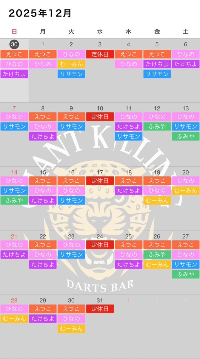 12月のシフトです🐆🎯 今月は店長えッちゃん、リサモン、ふみやのお誕生月🎂 それに伴い、シングルミニカップ開催決定✨ エントリーご希望の方は、ジャイキリSNSまたはスタッフへのご連絡お願いします🙇♀️🙇 キャンペーンも引き続き挑戦してください😌 12月も皆様のご来店お待ちしております✨