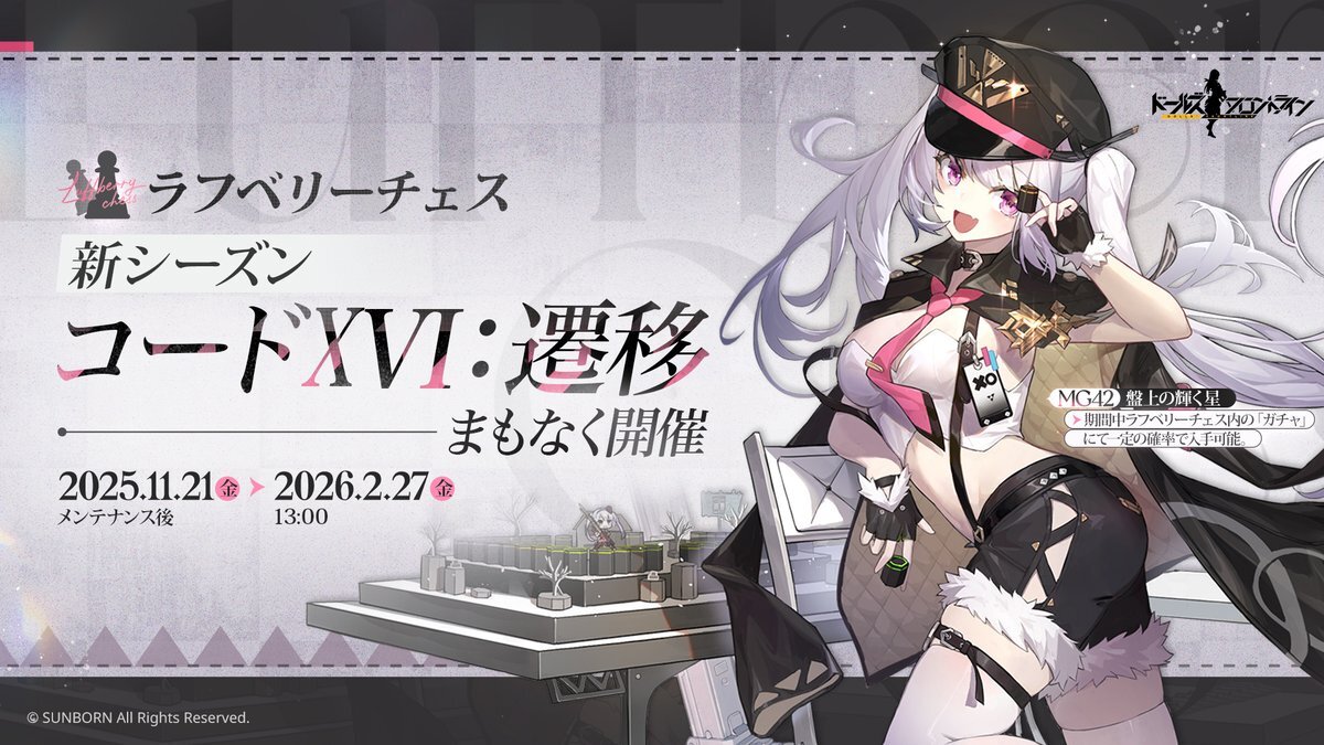 【ラフベリーチェス 予告】 「11月21日(金)メンテナンス後」より「ラフベリーチェス」の新シーズン「コードXⅥ:遷移」が開始されます。 ラフベリーチェス内のガチャでMG42専用スキン「盤上の輝く星」が入手可能ですので、報酬のガチャ券で入手しましょう! #ドルフロ #チェス pic.x.com/tRzKu94rNe