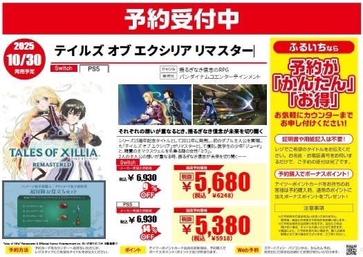 💛予約受付 10/30(木)発売 #Switch #PS5 テイルズ オブ エクシリア リマスター 2人の主人公の視点から描かれる重厚な物語‼️ オリジナル版の感動的な物語と爽快なバトルはそのままに、より快適なプレイが可能に✨ #テイルズ #TOXR #エクシリア pic.x.com/uQfoICHneC x.com/tales_ch/statu…