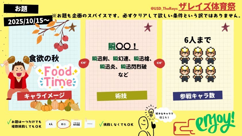本日15日はテイルズデー!🎊 焼き芋がおいしい食欲の秋! 大食…食べ盛りなキャラたちと一緒にザレイズを遊びませんか? 遊んでる様子をぜひXへ投稿してください♪ お気軽な参加お待ちしてます📷 また今月の攻略を考える会は22日に開催予定です。お楽しみに! #ザレイズ体育祭 #ザレイズ #テイルズ pic.x.com/g4kEax65sc