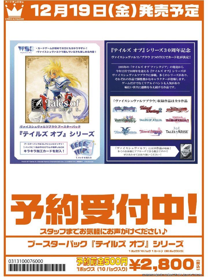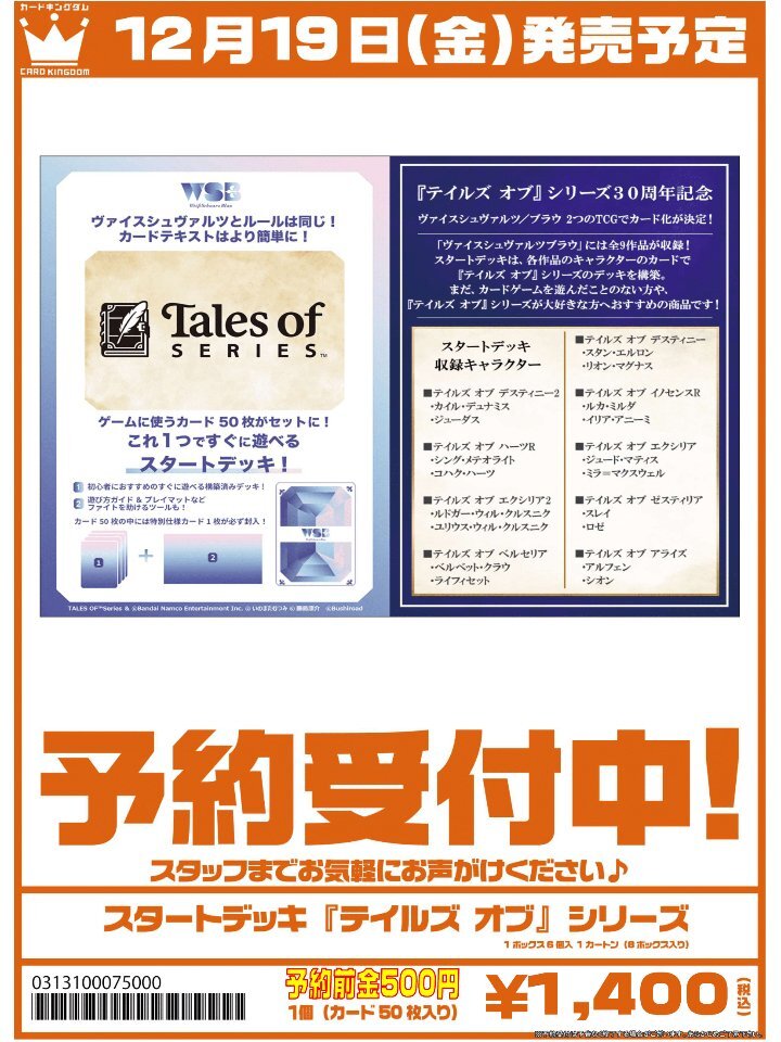 【#CK川口予約情報】 12/19発売 ヴァイスシュヴァルツブラウ スタートデッキ&ブースターパック 「『テイルズ オブ』シリーズ」 ご予約受付中です! 皆様の予約お待ちしております♪ 当店ではシングルカードも取り扱い予定です! ヴァイス(ブラウ)を買うならカーキン川口まで! #テイルズ #WSブラウ pic.x.com/v0tNbjetfC