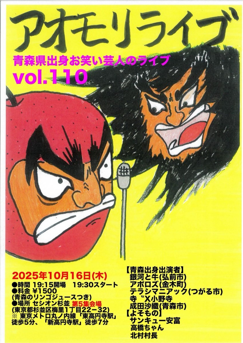 どんず⭐️ 本日10月16日 アオモリライブ!! セシオン杉並にて! ¥1500りんごジュースあり流血なし #銀河と牛 #アポロズ #テラシマニアック #寺X小野寺 #成田沙織 #サンキュー安富 #高橋ちゃん #北村村長 #青森 #お笑いライブ #テーブル #家具 #ニトリ pic.x.com/ioXOOTSK10