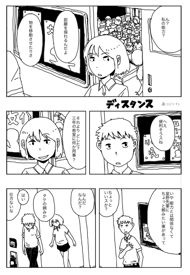 ディスタンス』 Distans 距離、道のり、間隔、かなりの距離、遠方、隔たり、経過、広がり、(血縁・身分などの)相違、懸隔) [原義は「離れて立つこと」] 距離のお話です。 『ディスタンス#ディスタンス #ツジコマコ 1/7 pic.x.com/P9tUteXCjG