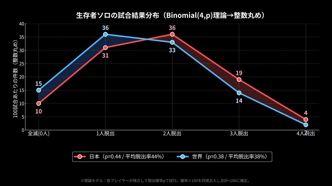 世界と日本のソロ脱出率の差が実際の試合結果分布だとどんな感じなのかAI君に計算してもらったらこうなった 2逃げ以上だけを通電だとしても日本ソロサバは60%くらい通電してるのか 1人逃げにもいくらか通電があるとすると65%くらいは通電してるのかねぇ #DBD #デドバの日 pic.x.com/7E2HBCEkax
