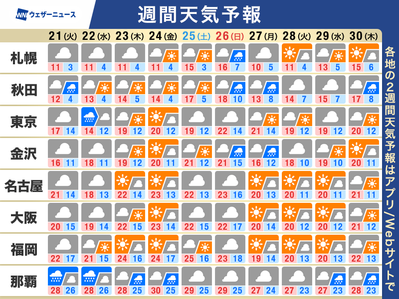 【週間天気】この先のポイント ・北海道は寒気の影響で内陸は雪の日も ・南岸に前線停滞 週前半ほど雨の可能性 ・全国的に季節進む 東京で12月並み予想も ▼詳しくはこちら weathernews.jp/news/202510/20…