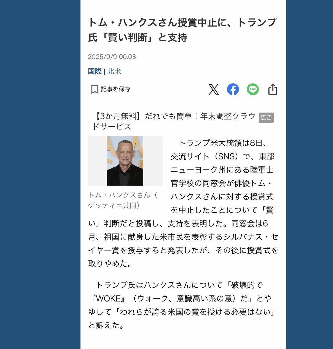 #トム・ハンクス 授賞中止に トランプ氏「賢い判断」と支持 sankei.com/article/202509… @Sankei_newsより pic.x.com/Ly2K2bmKlD