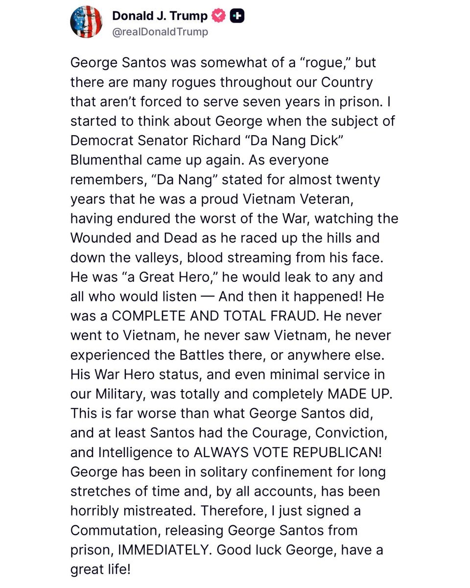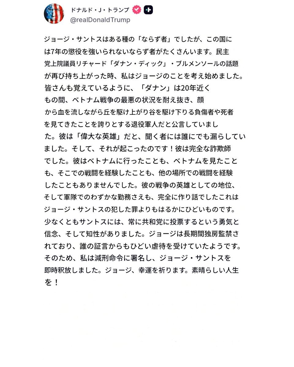 1/ トランプ大統領は、詐欺罪で有罪判決を受け、懲役7年以上の刑を言い渡されていたジョージ・サントス元下院議員の減刑を決定した。 大統領によると、サントス氏は長期間独房監禁生活を送っていたと報じられている。 → #トランプ #ジョージ・サントス pic.x.com/GiSz8YriML