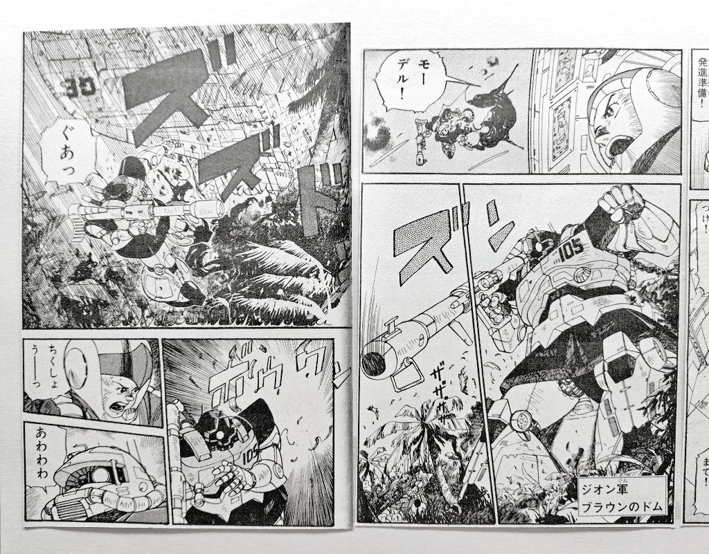MS戦記のジャブローへの降下の回のドムシーンを紹介します。主人公のブラウンが戦場で戦う姿が大変リアルでした。当時はプラモ狂四郎と並ぶ熱い感動を呼ぶ漫画でした。このMS戦記は永遠の傑作漫画だと思います。