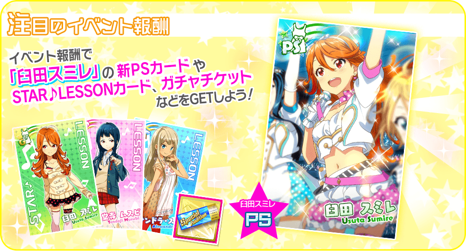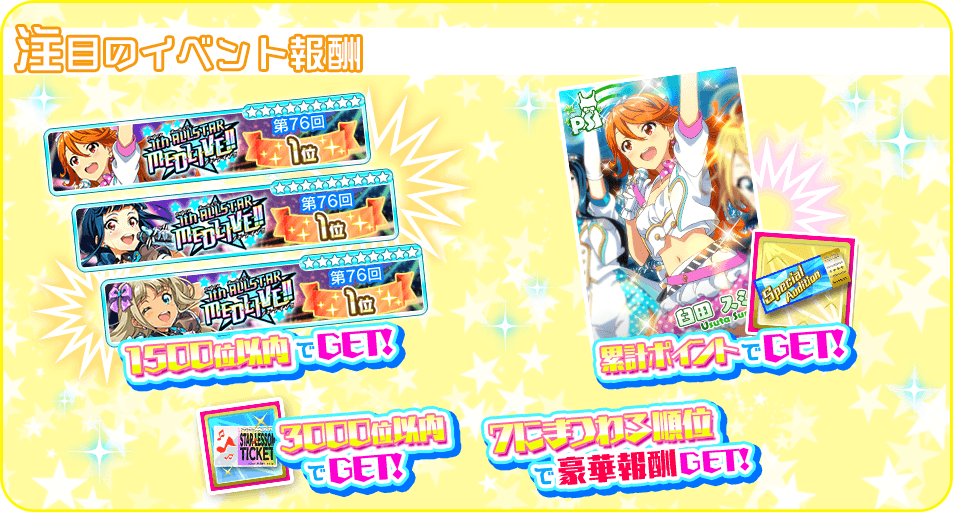 今回開催されるイベント「7th ALLSTAR M-E-D-L-I-V-E-!!」の報酬をご紹介! 目玉報酬は、スミレちゃんの新PSカード!✨ 他にも、ポイント達成報酬でガチャチケットなど様々な報酬獲得のチャンス! 777位など7のつく順位などでも、報酬盛りだくさん!! #t7s #ナナシス pic.x.com/Dbh1yzVNua