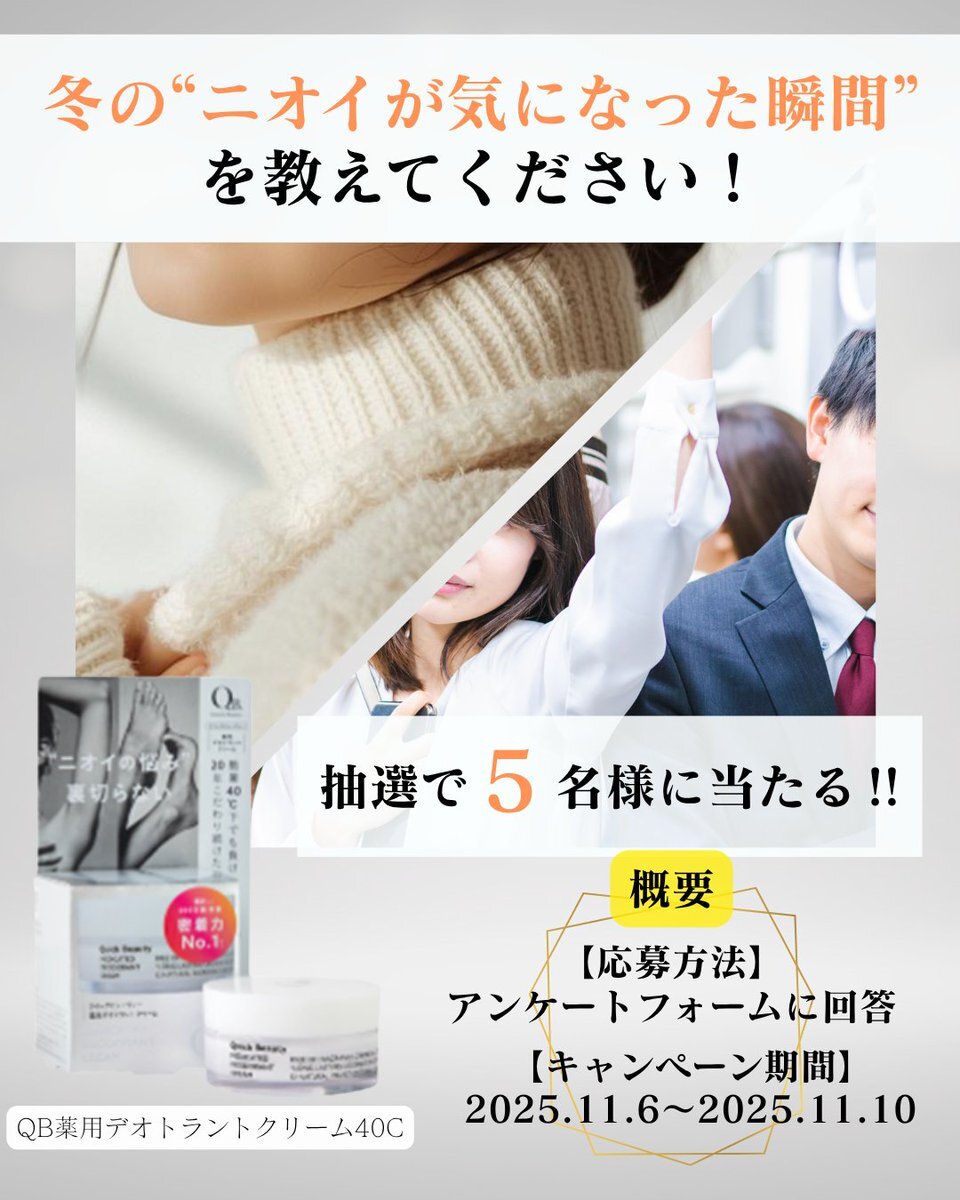 ご応募は本日まで!! 冬のニオイエピソード、お待ちしております🙇‼ #quickbeauty #QB #デオドラント #QB薬用デオドラント #ニオイ #ニオイケア #ワキガ対策 #ニオイ対策 #汗対策 #ニオイあるある #クイックビューティー #ワキガ #キャンペーン企画 #プレゼントキャンペーン x.com/liberta_item/s…