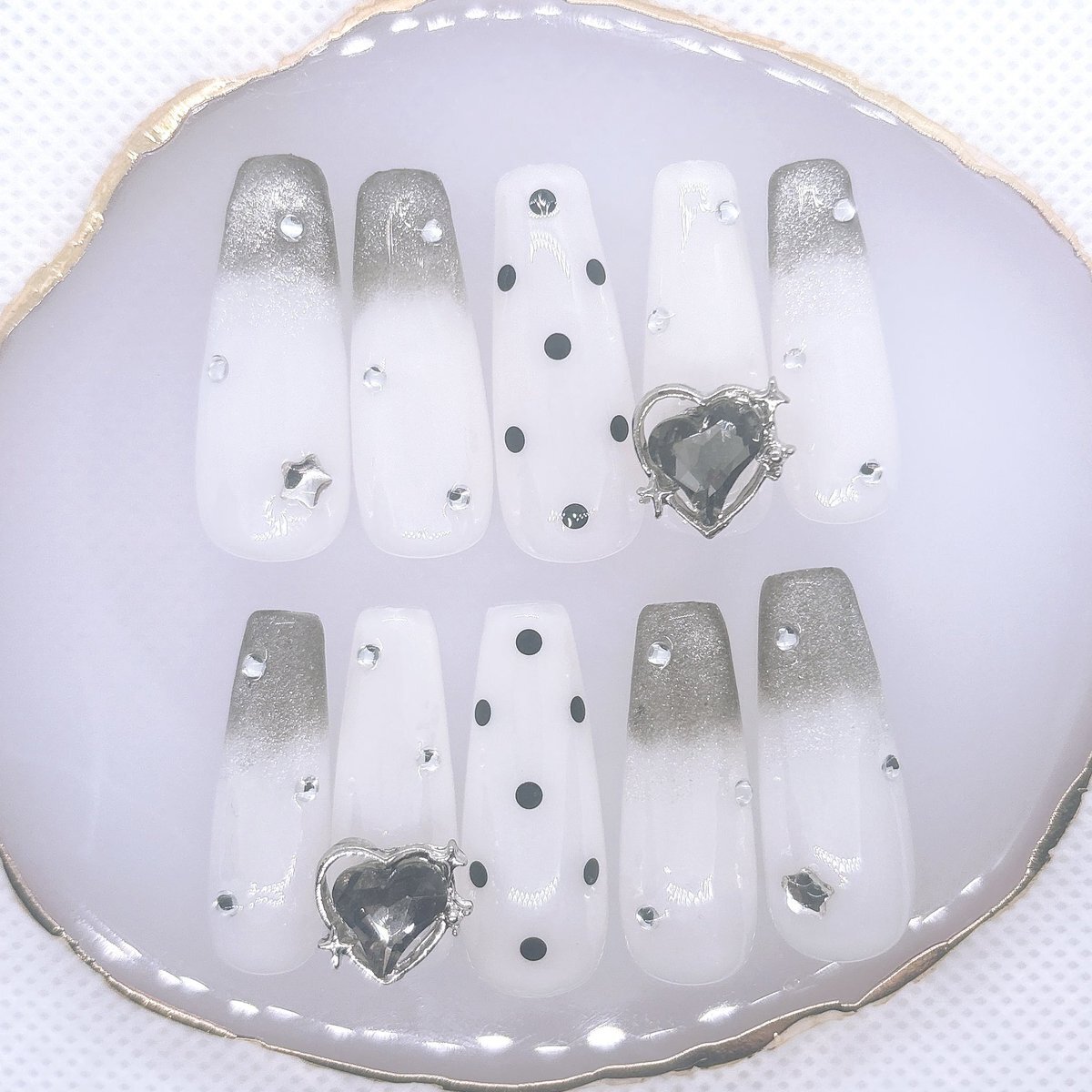 Y2Kみのあるパーツが主役のホワイト×ブラックの超可愛いネイルチップの販売が開始しました.′.′⟡.· 販売先🌷 minne minne.com/items/44273261 メルカリ jp.mercari.com/item/m23981723… #ネイルチップ #ネイルデザイン #Y2K #ネイルチップオーダー pic.x.com/QWj1lxTuW4