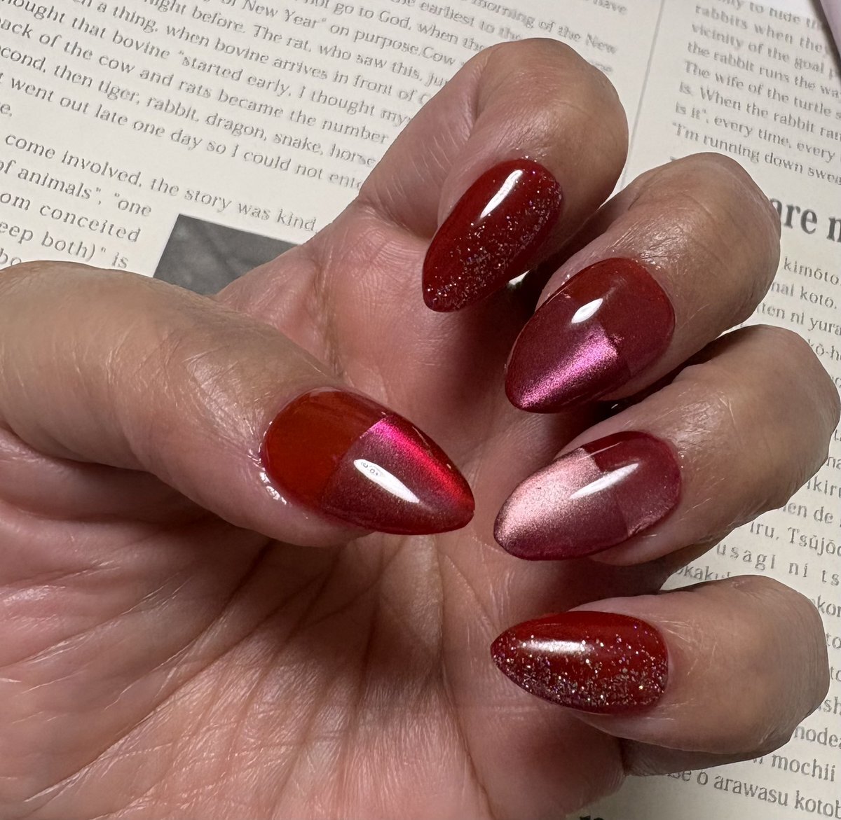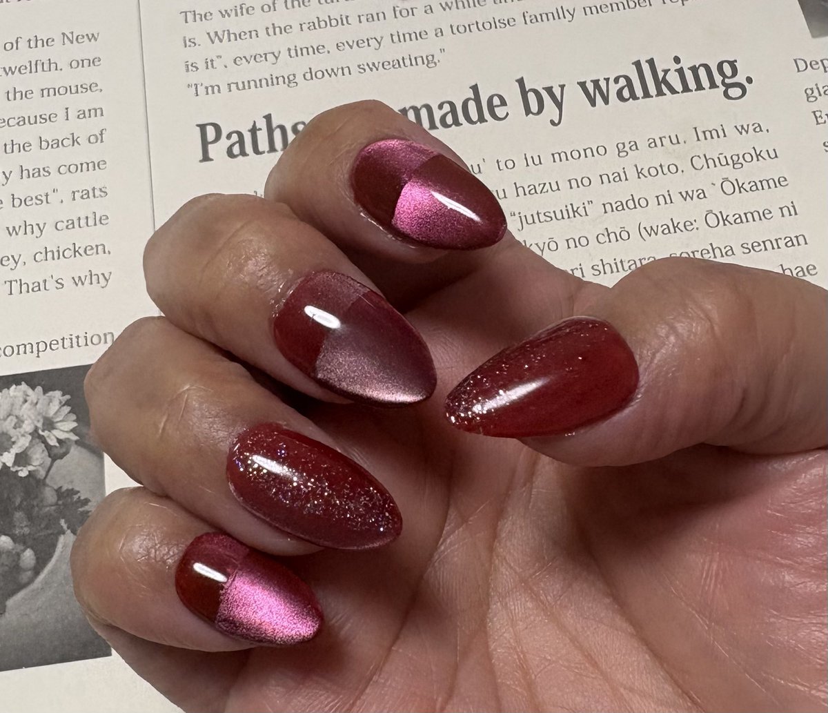 ハンド 定額デザイン 粒子の細かいゴールドのラメと深みのあるワインレッドでクリスマスシーズンにぴったりなネイルです! どちらもパーツ変更、カラー変更自由にできます◎ #鎌倉ネイルサロン #大船ネイルサロン #ネイルデザイン #ネイルアート #冬ネイル #大人ネイル #定額ネイル pic.x.com/x0sWTilp3m