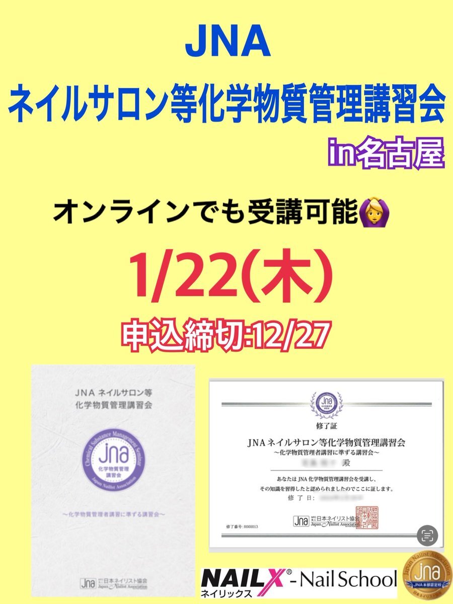 化学物質管理者養成のための 「JNAネイルサロン等化学物質管理講習会」を実施します🙋♀️ #ネイリスト #ネイル材料 #ネイル用品 #ネイルスクール #ネイルサロン #化学物質管理講習会 #化学物質管理者 #化学物質リスクアセスメント pic.x.com/N2jB6Nu5RD