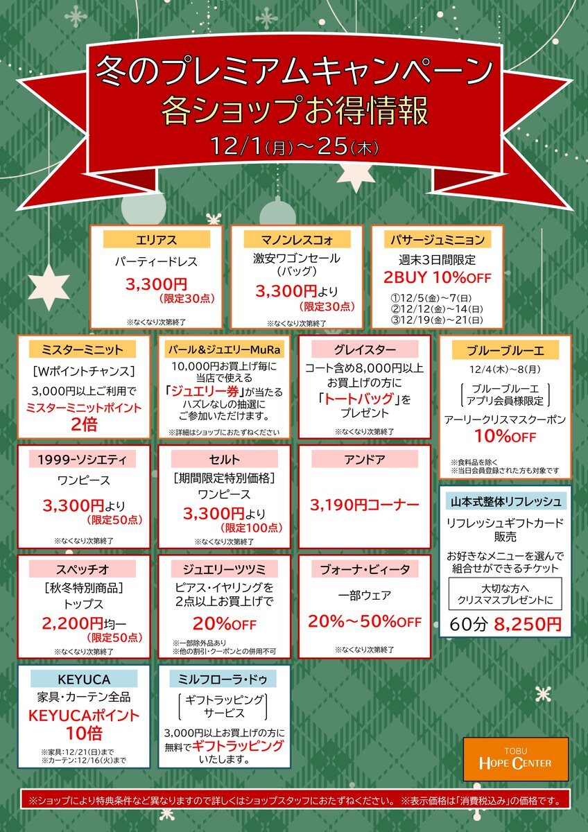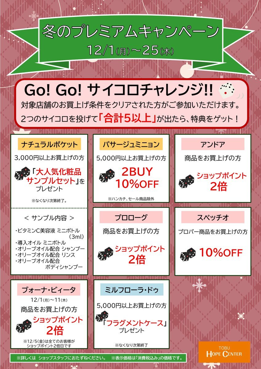 本日から12/25(木)まで「冬のプレミアムキャンペーン」を開催🎊期間中の各ショップお得情報やGo! Go! サイコロチャレンジ🎲の対象店舗をご紹介いたします💁🏻‍♀️各ショップにより開催期間、お得情報が異なりますのでお見逃しなく‼️ #池袋 #西口 #東武ホープセンター #お得 #特典 #ノベルティ #期間限定 pic.x.com/aX8F9yRsmg