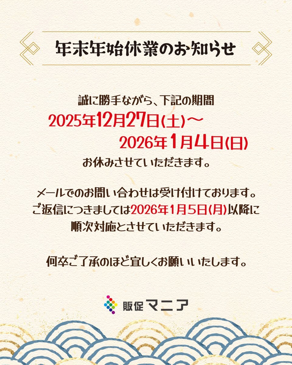 【年末年始休業のお知らせ】 2025年12月27日(土)〜2026年1月4日(日)の期間はお休みさせていただきます。 メールでのお問い合わせは受け付けております。 ご返信につきましては2026年1月5日(月)以降に順次対応させていただきます。 #販促マニア #ノベルティ #オリジナル #記念品 #名入れギフト pic.x.com/aIJzElF98o