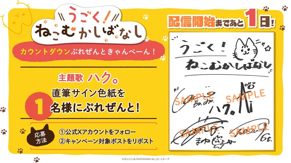 🐱*\カウントダウンきゃんぺーん!/*🐈 『うごく!ねこむかしばなし』 配信開始まであと1⃣日! 主題歌担当の #ハク。さん 直筆サイン入り色紙 1名様にぷれぜんと🐾🎁 🐱応募方法🐱 ①本アカウントをフォロー ②本投稿をリポスト 🐱応募締切🐱 10/28(火)23:59まで #ねこむかしばなし