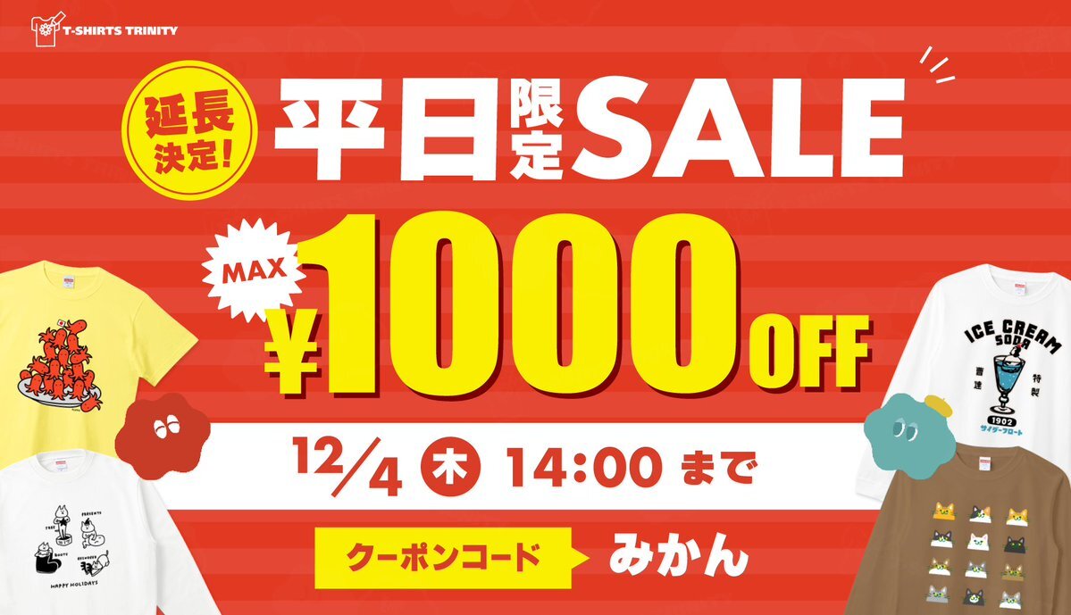 \ご好評につき延長決定🎉/ 平日限定SALE🉐 大人気のTシャツをはじめ、ロンT、 スウェット、パーカーなど最大1,000円引き‼️ 冬に大活躍するアイテムを おトクに手にいれるチャンスです🌟 どうぞお見逃しなく💨 ⏰ 開催期間 2025年12月2日(火)14:00 〜 12月4日(木)14:00 🎫200円引きクーポン配信