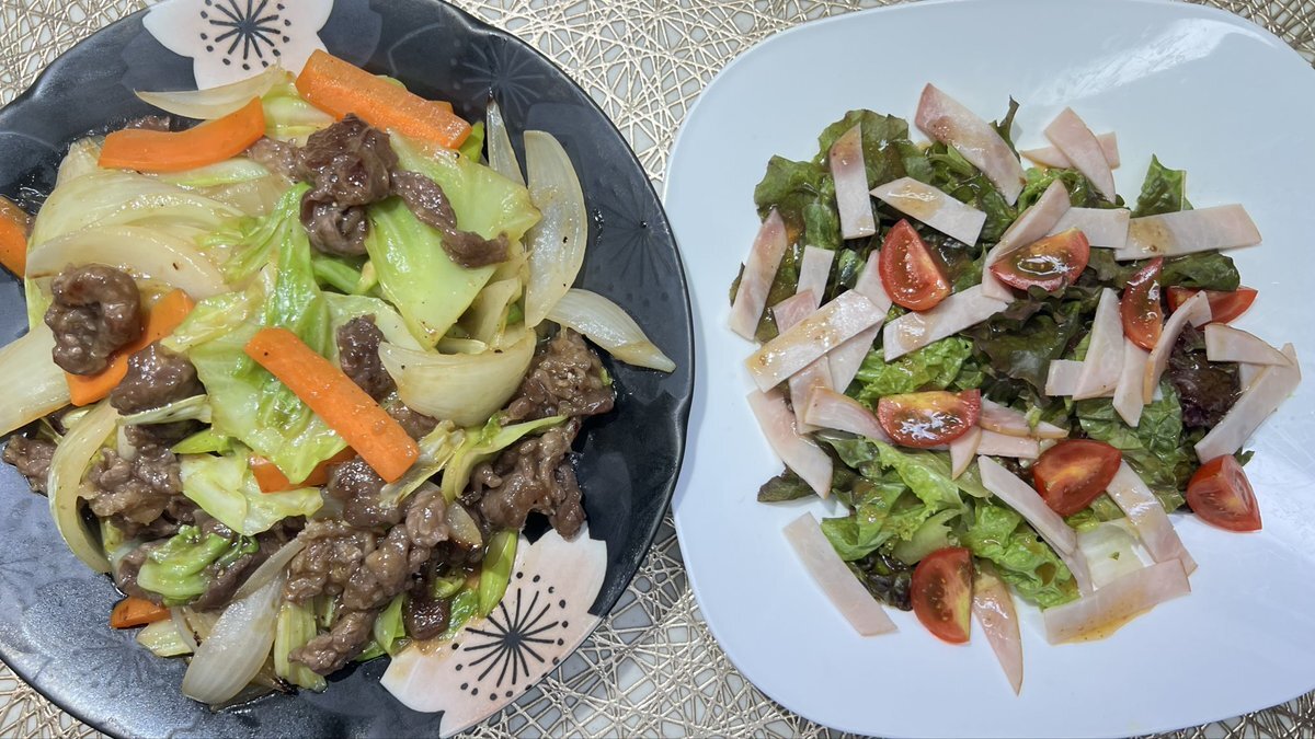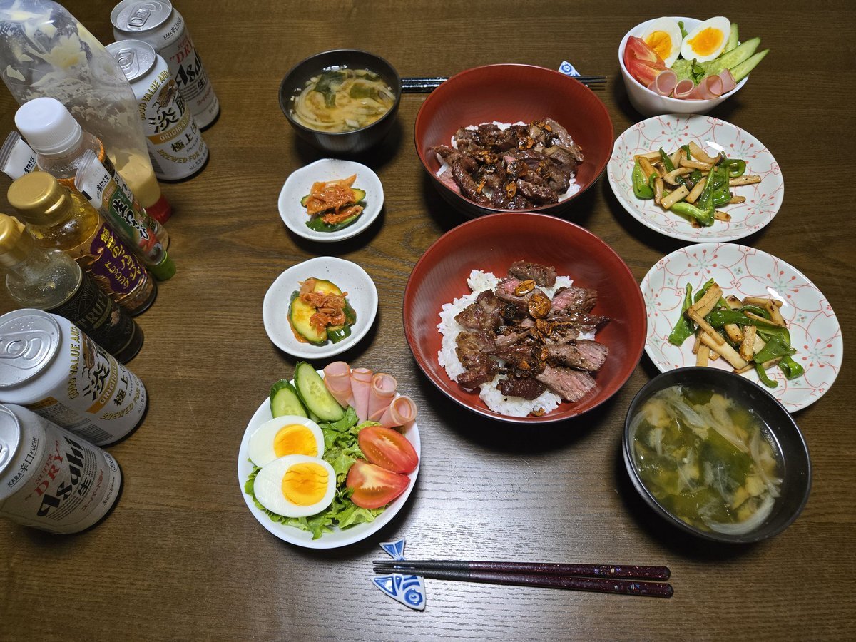 アミティ快適化で汗だくになりながら何とかDIYしてエペしてたらもうこんな時間 週末短いわー #牛肉と野菜のニンニク炒め #ハムサラダ pic.x.com/FRIdsQ85TM