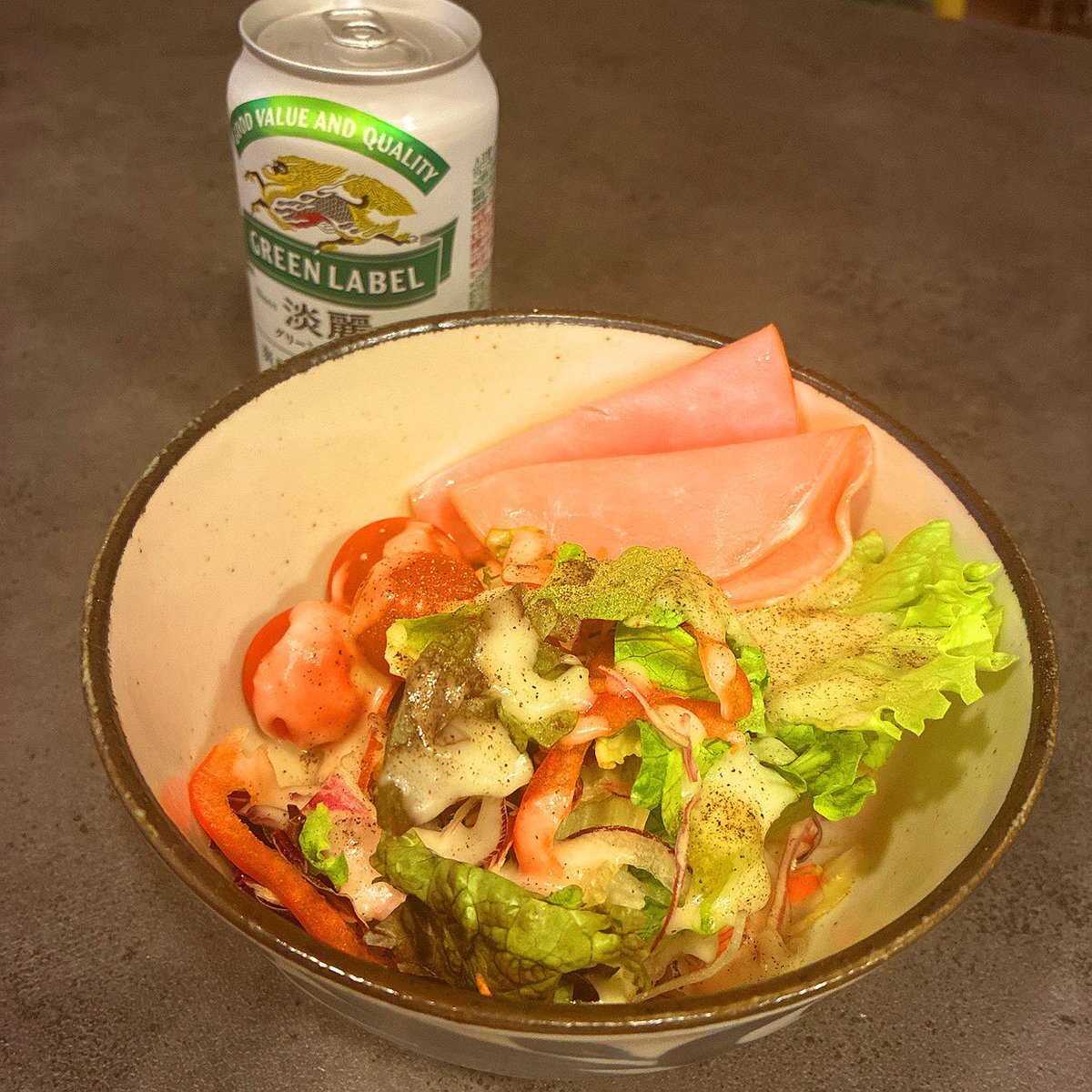 お家で作業しながら、とっても雑なハムサラダ晩酌してます。タコハイの芳醇プレーン、飲みやすい★#ハムサラダ pic.x.com/Tk9uqDPrkf