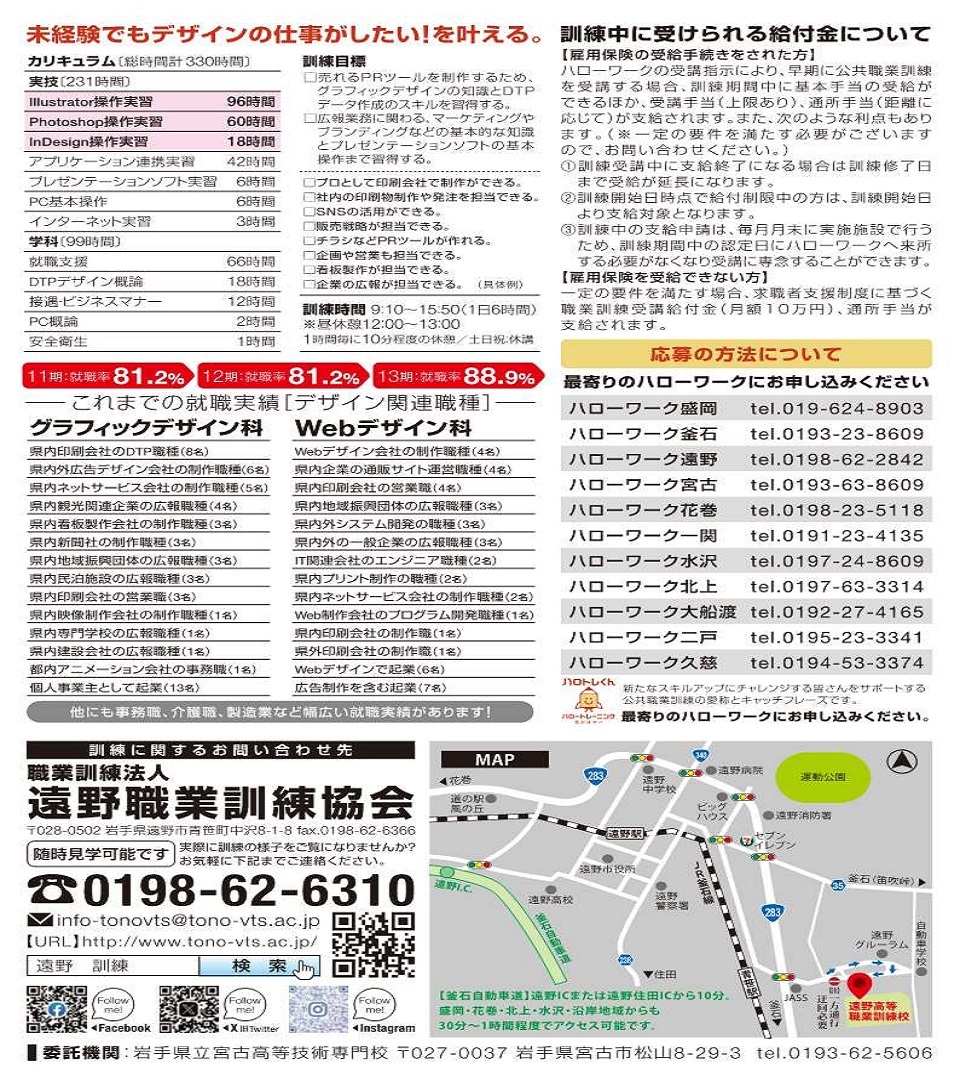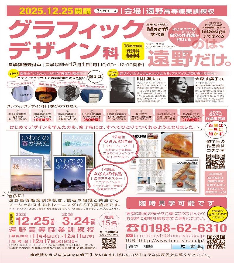 【#ハロートレーニング のご案内】 ⚠️⚠️募集締切12/11(木)まで⚠️⚠️ 🔶グラフィックデザイン科2(#遠野市) 🔷開講日:12/25(木) 未経験でも基礎から技術を学べます‼️ #職業訓練 #岩手県 #資格 #事務 #ハローワーク pic.x.com/xoqftzKemS
