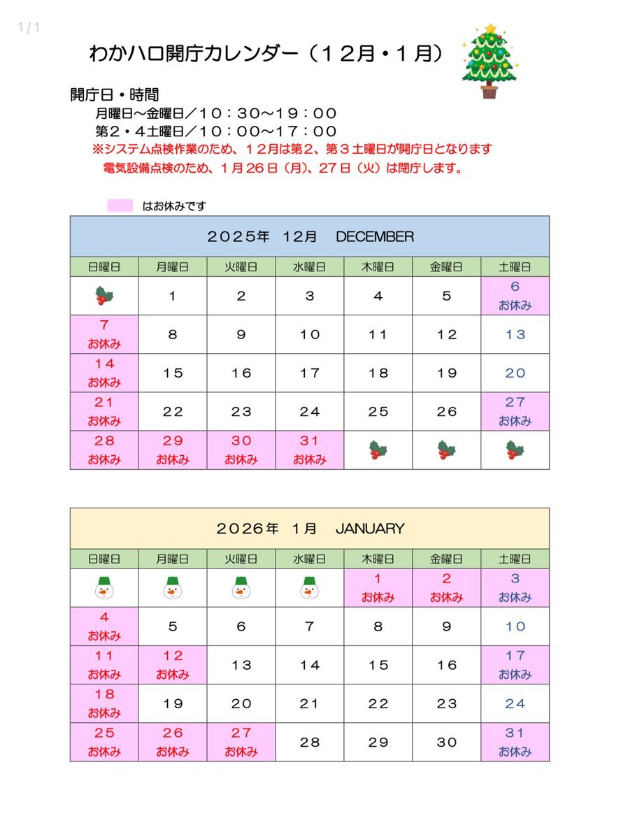 🔔#富山わかものハローワーク からのお知らせです わかハロの12月〜1月の開庁日はカレンダーのとおりとなっております。平日と第2・4土曜日が基本的な開庁日ですが、変更となる場合もありますので、ご利用の際はカレンダーをご確認ください。 #ハローワーク #富山 #転職 pic.x.com/LnJIp578ob