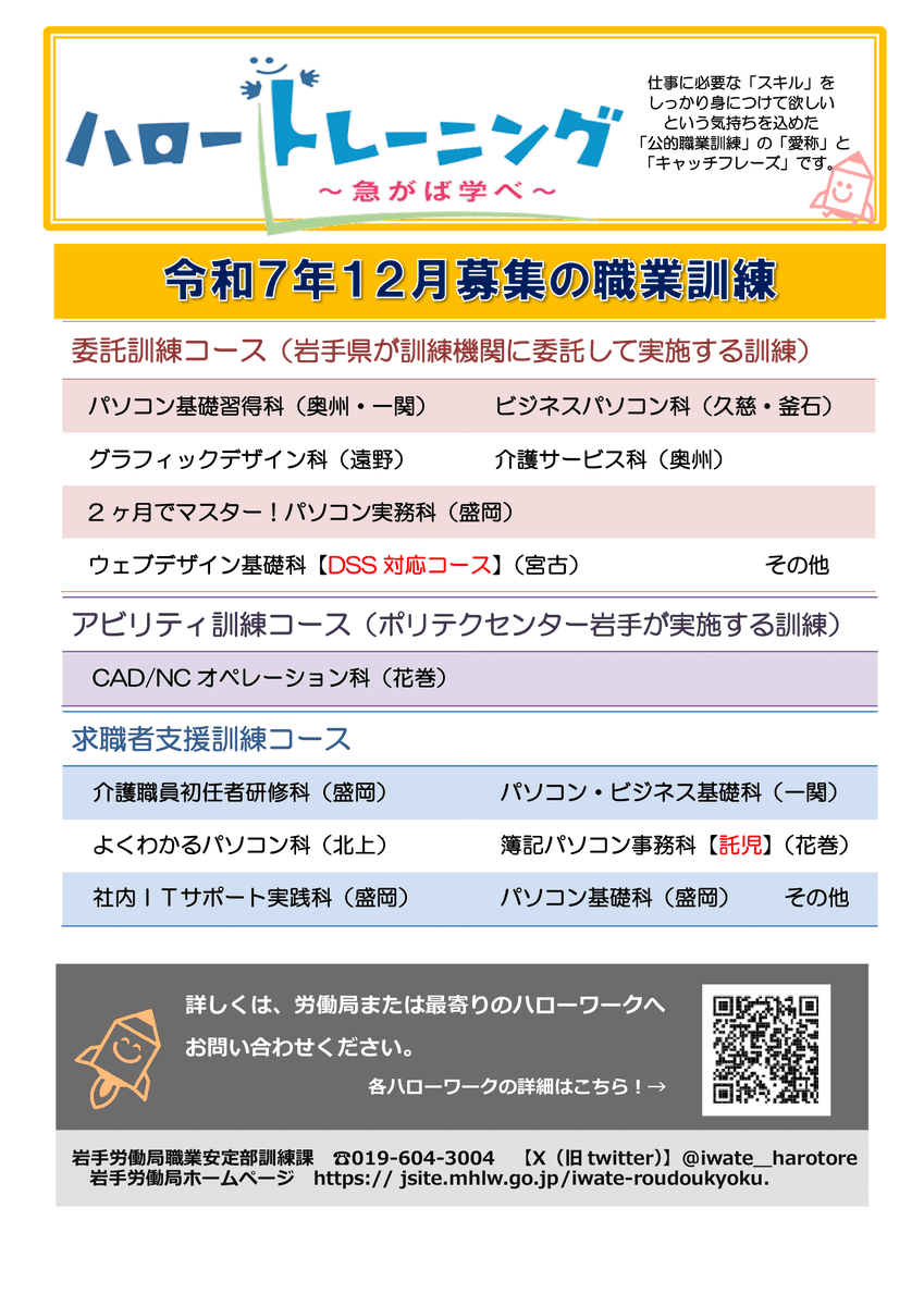 岩手労働局から #職業訓練 のご案内 12月から募集開始! #ビジネススキル や #介護 を学ぶ訓練コースをご紹介! 基本から学べるので苦手な方でも安心! また、2年間の間で #国家資格 を取得し #正規雇用 を目指す #長期高度人材育成コース の募集も近々始まります! jsite.mhlw.go.jp/iwate-roudouky…