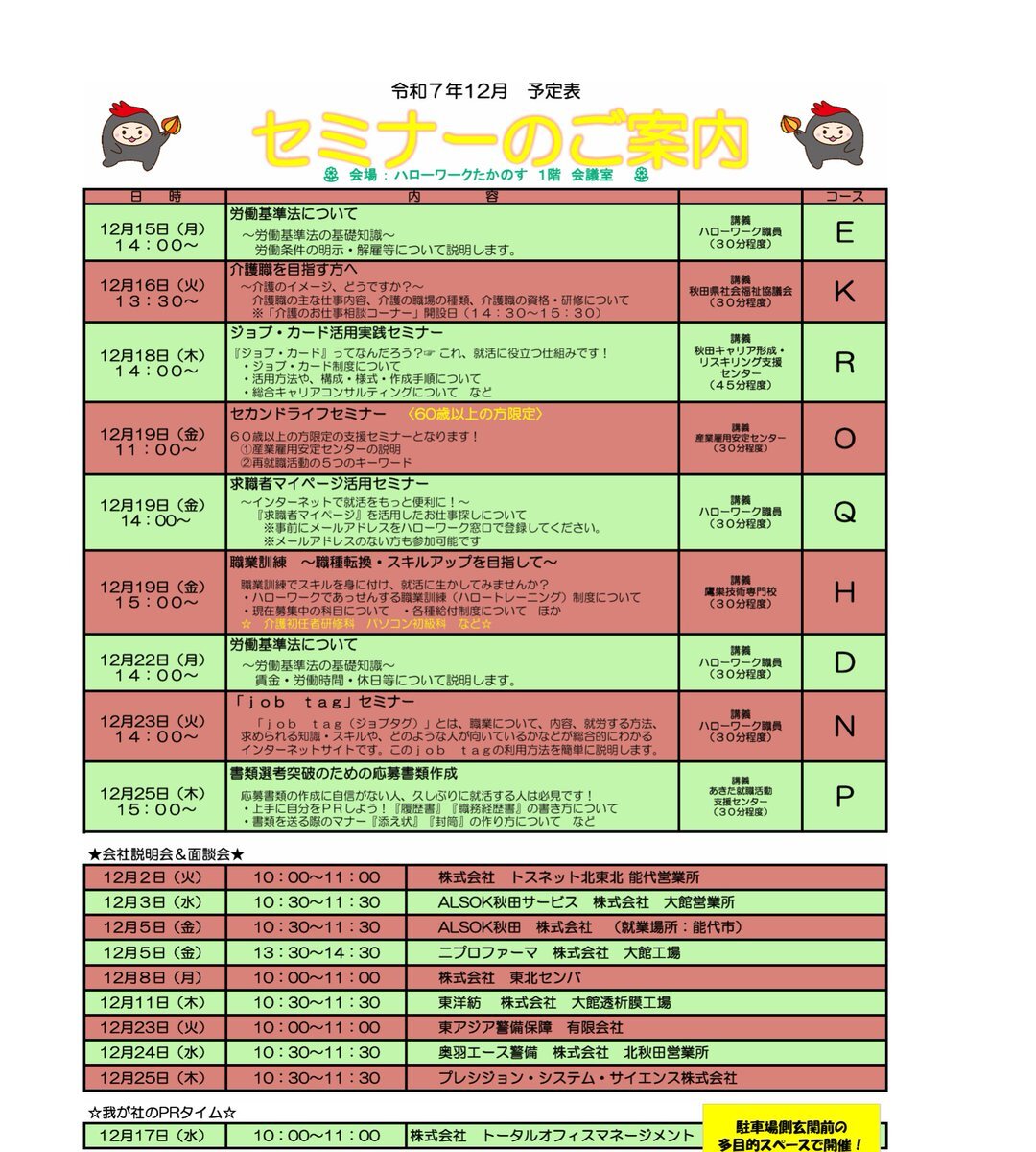 【12月の就職支援セミナーのご案内】#ハローワーク鷹巣 県内のハローワークで開催される就職支援セミナーは、秋田労働局のホームページからも確認できます(内容が変更になる場合があります)☃️🔽 jsite.mhlw.go.jp/akita-roudouky… #秋田労働局 #ハローワーク #セミナー #北秋田市 pic.x.com/MGFoojVawD