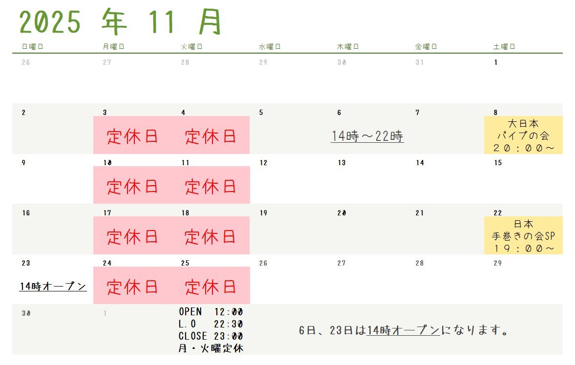 11月のカレンダーです。 6、23日は営業時間が変更になっております。 お気をつけ下さい。 #smokerplanet #たばこ #カフェ #店内喫煙可能 #手巻きたばこ #葉巻 #シガー #パイプ #zippoシルバーボール #大日本パイプの会 #日本手巻きの会 pic.x.com/4r1HNlfbEU