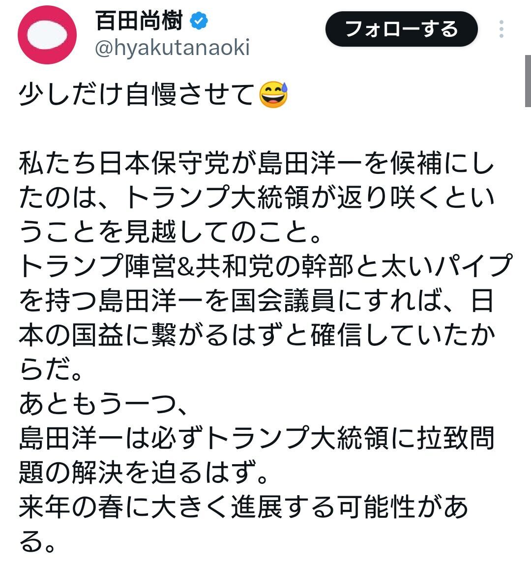 島田洋一議員のトランプ政権「太いパイプ」主張、来日接触なしで失望広がる #日本保守党 #日本保守党ボランティアチーム #日本保守党から日本を取り戻す #日本保守党から日本を護る #保守党 #パイプ #パイプカット x.com/i/trending/198…