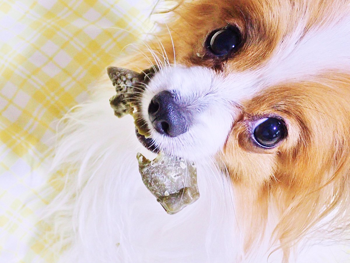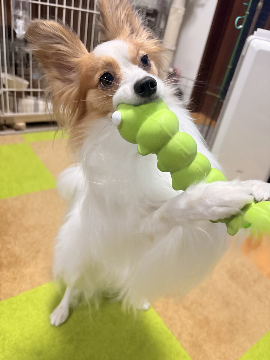 もえ🐾 サンプルでもらった緑色のワンコガム🐶 もえにあげたら大喜びでかじっていたよ😆 見せてくれるけれど"ちょうだい"って言っても渡してはくれない😂 ワニの形していたのだけれど少しの時間で跡形もなく🐊 #パピヨン #犬のいる暮らし #犬のいる幸せ pic.x.com/2yOjb1lecA