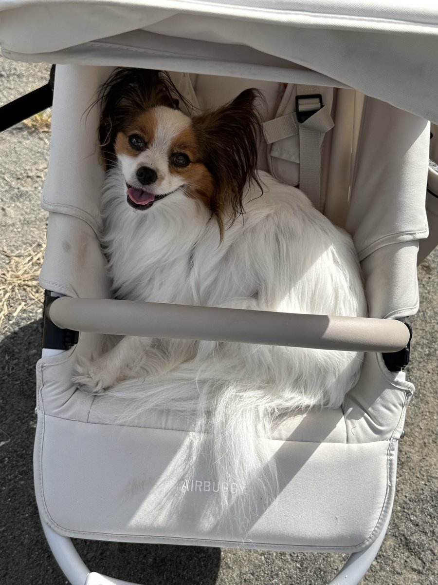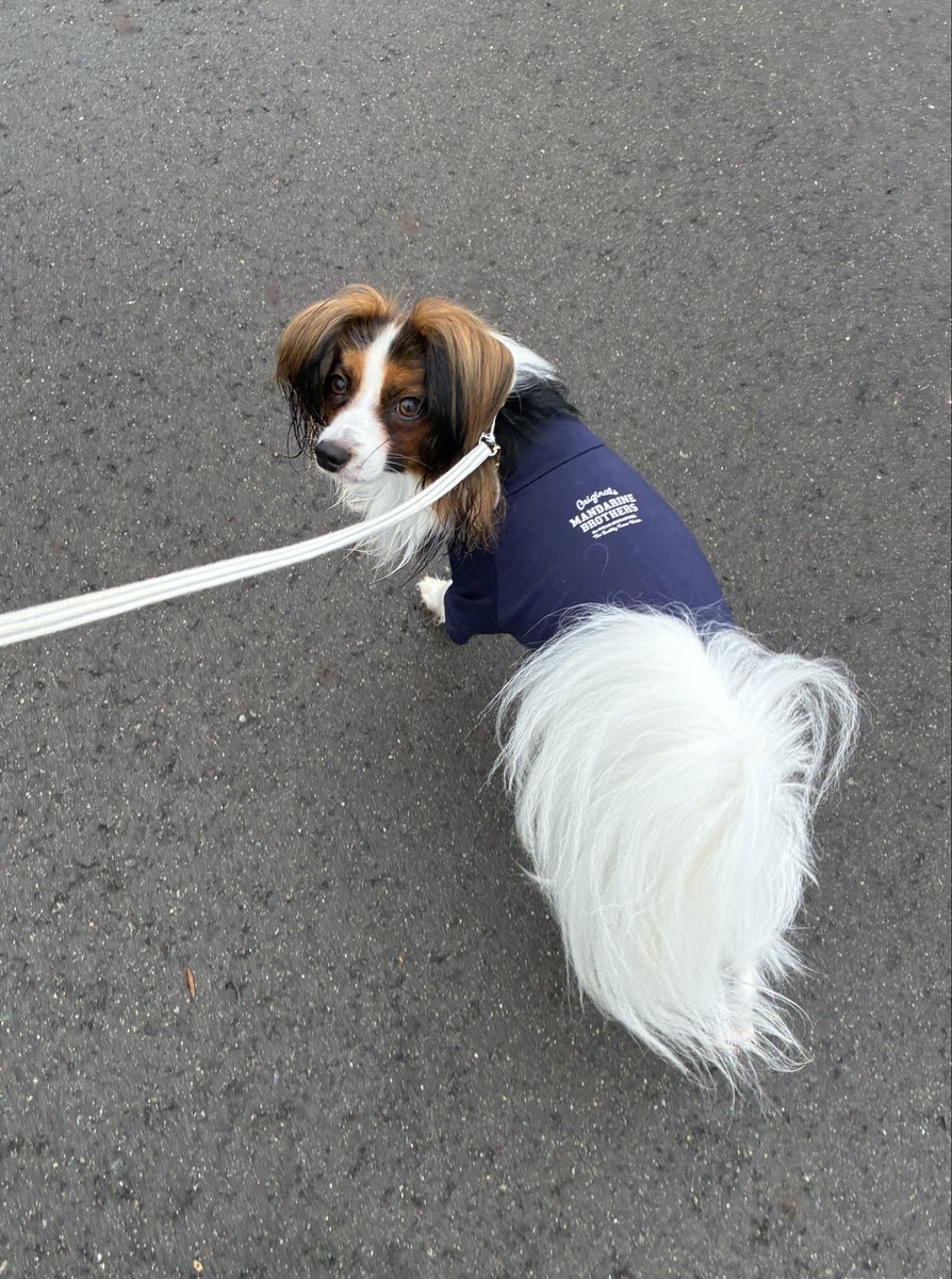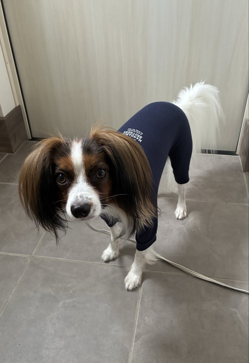 スキンタイトスーツデビュー🙌 枯れ草やら種やら雨上がりの泥はねやらが付かなくてとっても良さそう😳 ご本犬は不服そうですな🤣 #パピヨン #ファレーヌ #犬がいる暮らし #マンダリンブラザーズ #スキンタイトスーツ pic.x.com/UmDoPO0tZ0