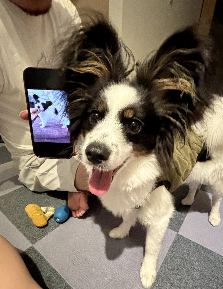 初めて貰った長いもの🐕💦 どうしたものかと しばらく遊んでました😂 「兄ちゃん 食べてるしなぁ🤔」 パピーなのに大人びたお顔をしてる気がする #パピヨン #犬好きさんと繋がりたい pic.x.com/swjl9E9MiP