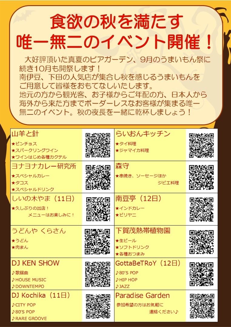 ❮南伊豆 うまいもん祭り🍻❯ 10月11(土)・12(日)の2日間連チャンで、町内外から7店舗のうまいもんが集まります‼️ #うまいもん祭り #ビアガーデン #南伊豆町 #下賀茂熱帯植物園 #南伊豆グルメ #南伊豆飯 #やっぱうめーな伊豆 #人が集まる町へ #南伊豆町をもっと面白く pic.x.com/uNdQw7pwVV