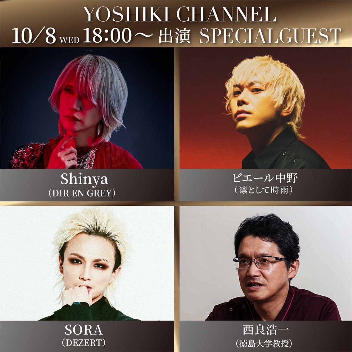 ✨本日放送✨ #YOSHIKICHANNEL 手術からちょうど1年となる10月8日18時から生放送! #YOSHIKI 、3度目の首の手術から復帰── 「健康と美」第3弾 ドラマー座談会に豪華出演者集結! スペシャルゲスト🎉 #Shinya (#DIRENGREY) #ピエール中野 (#凛として時雨) #SORA (#DEZERT) #西良浩一 pic.x.com/3B66gKHXwo