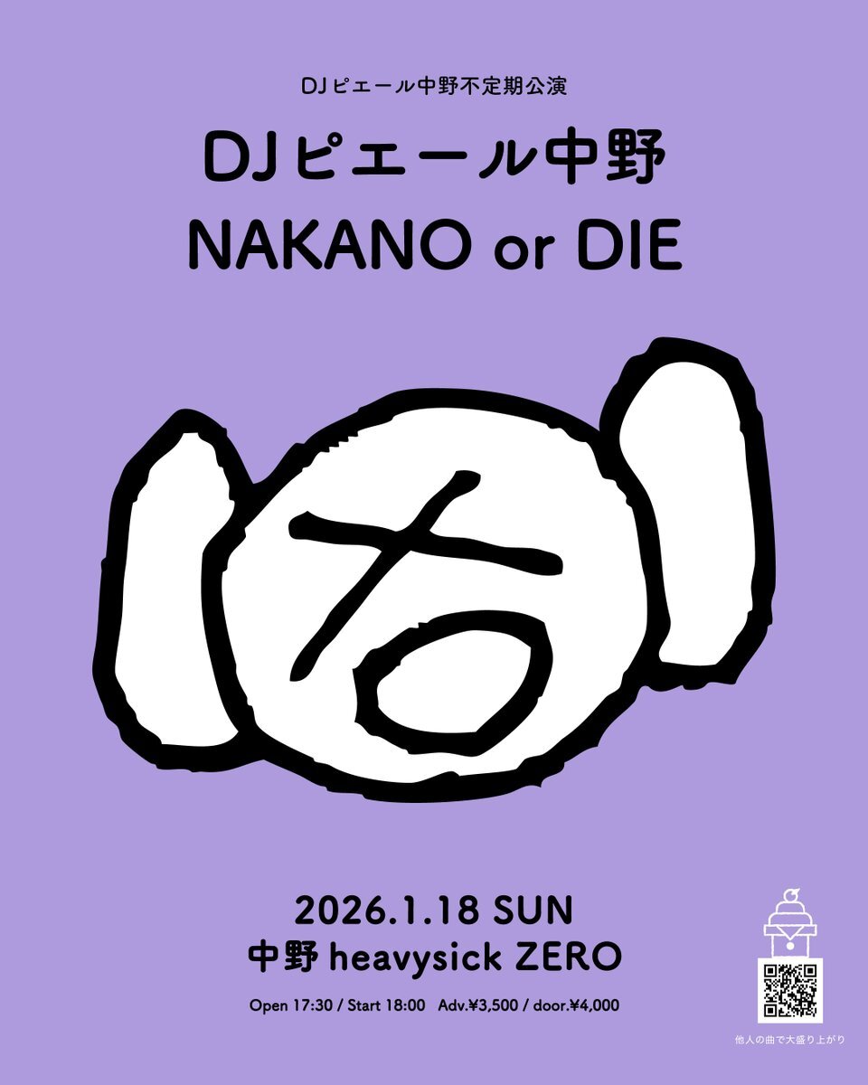 DJピエール中野 イベント情報 ━━━━━━━━━━ 2026/1/18(日)中野 heavysick ZEROにて「NAKANO or DIE」の開催が決定! DJピエール中野による新たなイベント、ゲストの出演もあるかも…? チケットは本日より販売スタート! 「NAKANO or DIE」 at中野 heavysick ZERO open 17:30 / start 18:00