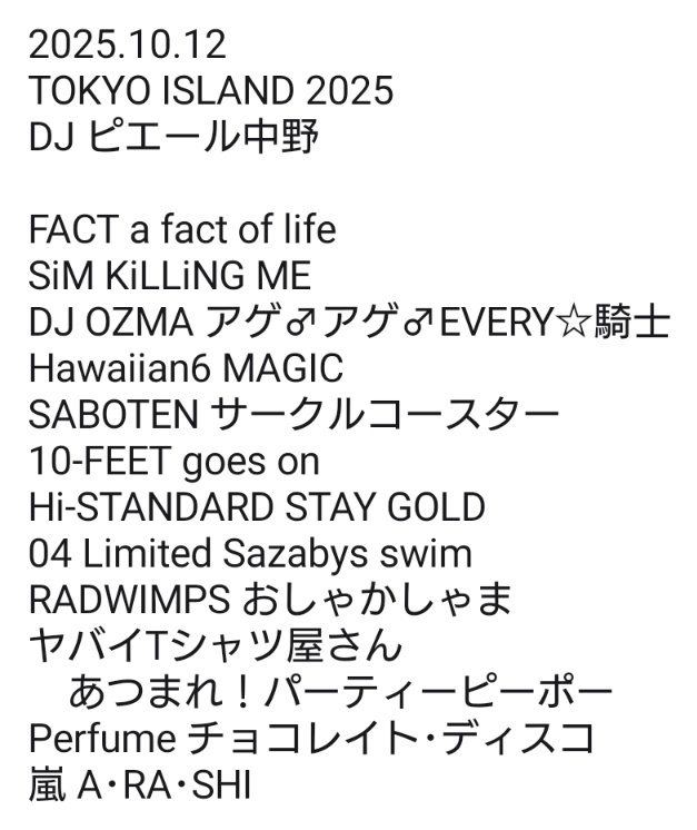 ピ様のDJ、楽しすぎて体力の限界を迎えたw その時間の運動量多いw “最初から激しく行くぞ!”からのFACTは神だし、大好きなHawaiianでサークル発生、それを見て急遽“サークルコースター”をぶっこむ… そのあともキッズ昇天の流れだった🥹 覚えてる範囲のセトリ神すぎる😇 #TOKYOISLAND #ピエール中野 pic.x.com/AuXwKPZw8h x.com/Pinakano/statu…