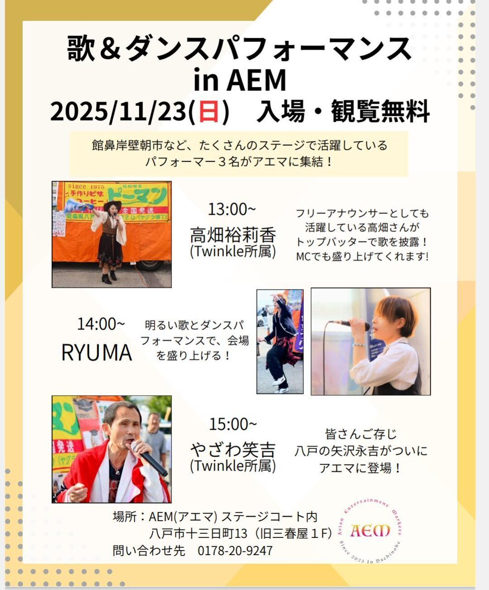 11月16日(日) の #館鼻岸壁朝市 では #ピーマン 🫑さんのブースにて、#やざわ笑吉 さんと、#トゥインクルアイドル研究生 によるライブを行います🎤🎶💃 時間は午前6時40分頃から🕡️ 見所満載の歌とダンス、トークで、心が熱くなる一時をお届けします💪❤️🔥✨ 是非 お越しください(^^)/ #青森 #八戸 pic.x.com/kKsyix14L6
