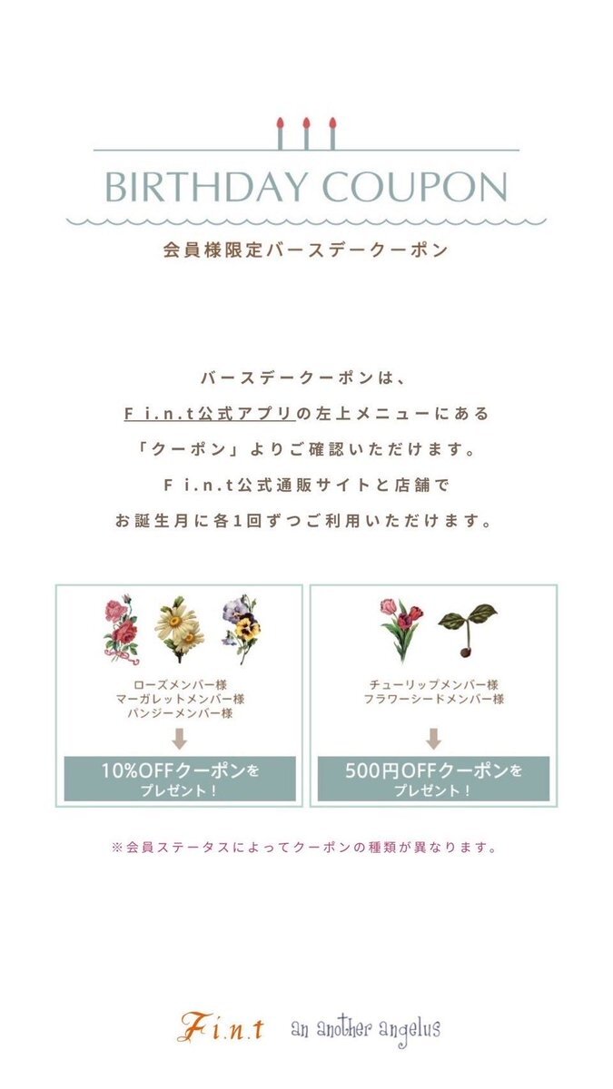 🎂𝐁𝐈𝐑𝐓𝐇𝐃𝐀𝐘 𝐜𝐨𝐮𝐩𝐨𝐧 誕生月にクーポンをプレゼント🧸🎁 F i.n.t公式アプリのプッシュ通知でお知らせが届きます♪ アプリ左上のメニューからクーポンをご利用いただけます❣️ fint-shop.com/f/birthdaycoup… 10月のお誕生日クーポン使用期限:10/31(Fri) #フィント #fint #横浜ジョイナス pic.x.com/gDPMbjZHDk