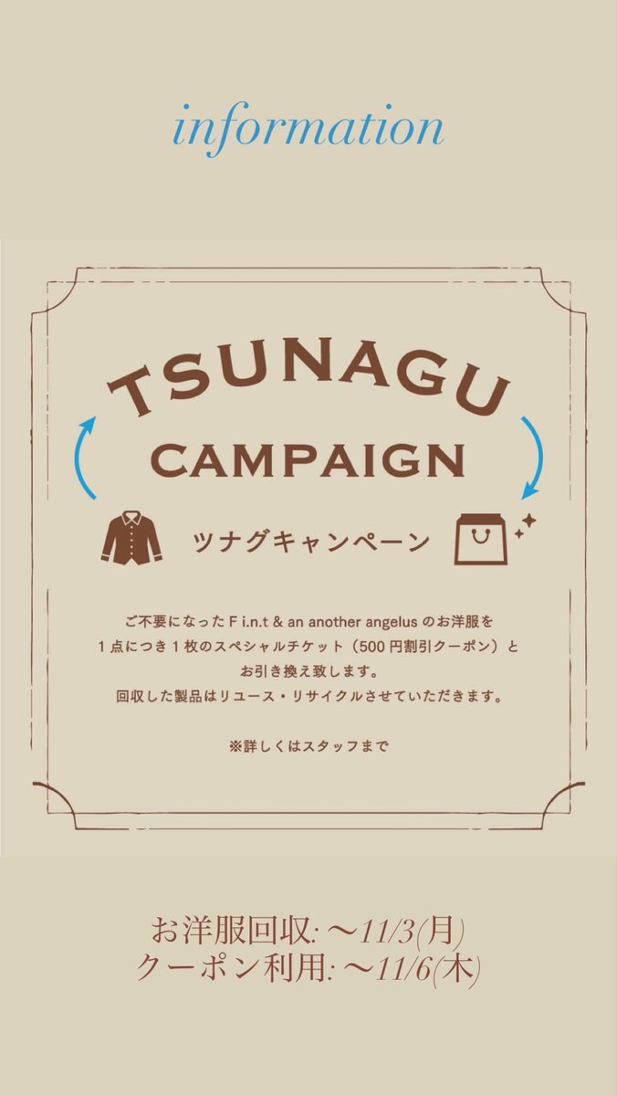 ♻️TSUNAGUキャンペーン♻️ 回収期間:9/1(月)〜11/3(月) 利用期間:配布〜11/6(木) ご不要になったフィントのお洋服1点につき 500円OFFチケット1枚とお引き換え致します🎟️ この機会に断捨離して 新しいお洋服をお迎えしましょう✨ #fint #フィント #横浜ジョイナス pic.x.com/4WTYIpc67y
