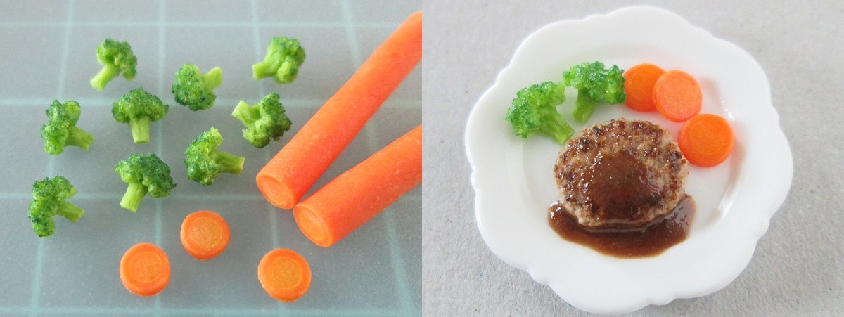洋食ディスプレイ☆ブロッコリーとニンジン作り ハンバーグにデミグラスソースをかけて、作った野菜を盛り付けて完成💫 いいねRPありがとうございます😆🩵 #フェイクフード #ミニチュア #ハンドメイド pic.x.com/kkFX2CkfnV