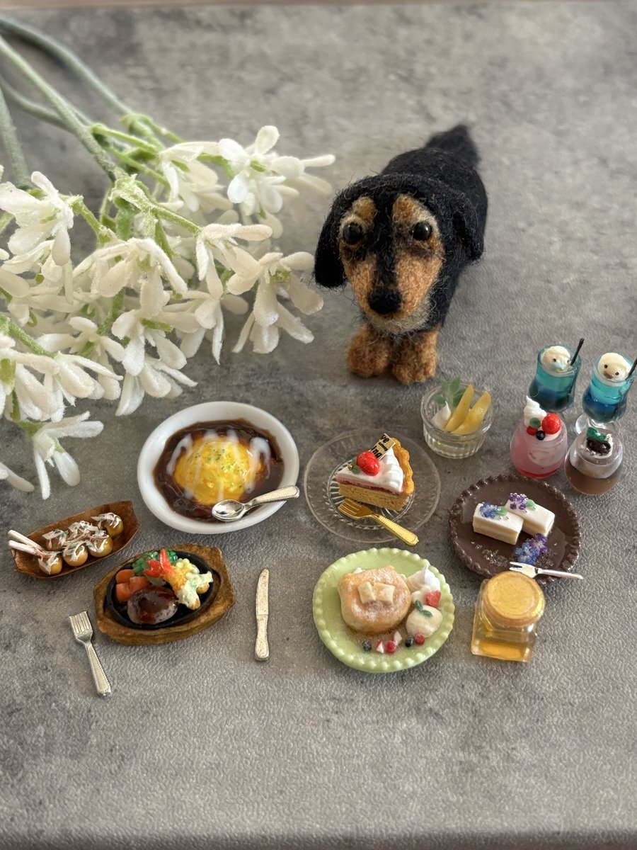 こんな感じでミニチュアと一緒に撮影するためにフェルト作家さんにオーダーお願いしたミニチュアダックス🐾激かわよ🥰 命名「みにりちゃん」です。 ぬい活する方達の気持ちがちょっとわかったかもしれん! #ミニチュアフード #フェイクフード #ぬい活 pic.x.com/rZZLQlNjn4
