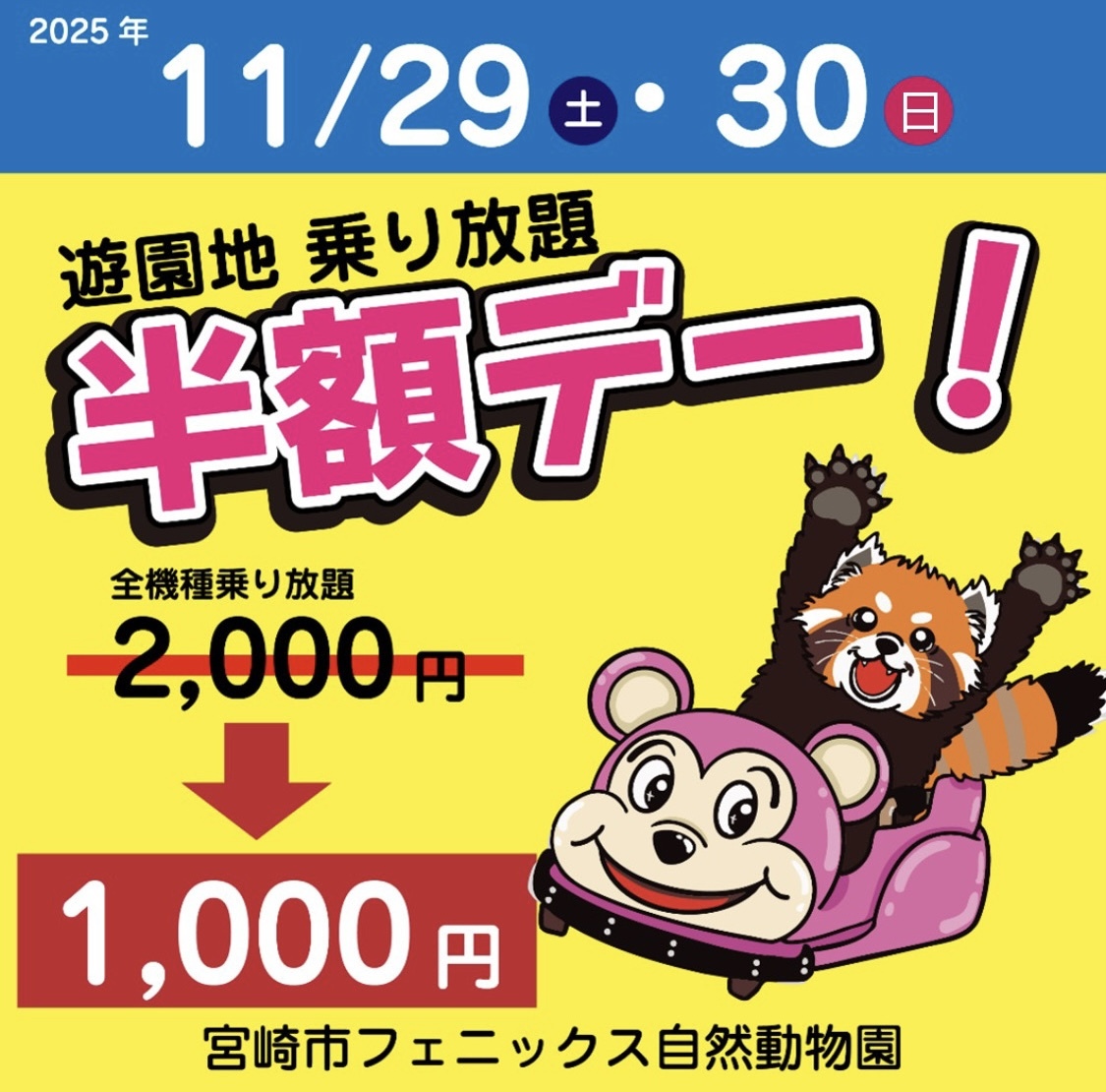 // 📣 #フェニックス自然動物園 遊園地乗り放題半額デー \\ 遊園地の「全機種乗り放題(通常2,000円)」が半額の1,000円で利用できます。 週末はフェニックス自然動物園で、楽しもう!🐘 詳しくはこちら🔗 miyazaki-city-zoo.jp/amusement-park/ pic.x.com/MuZo0wu5st