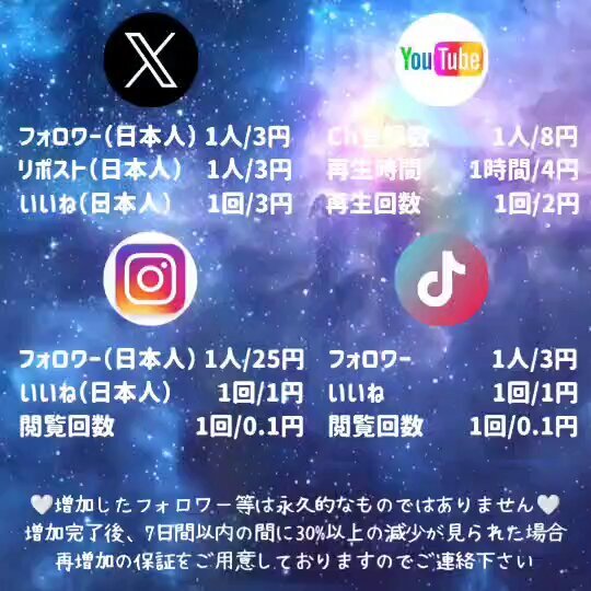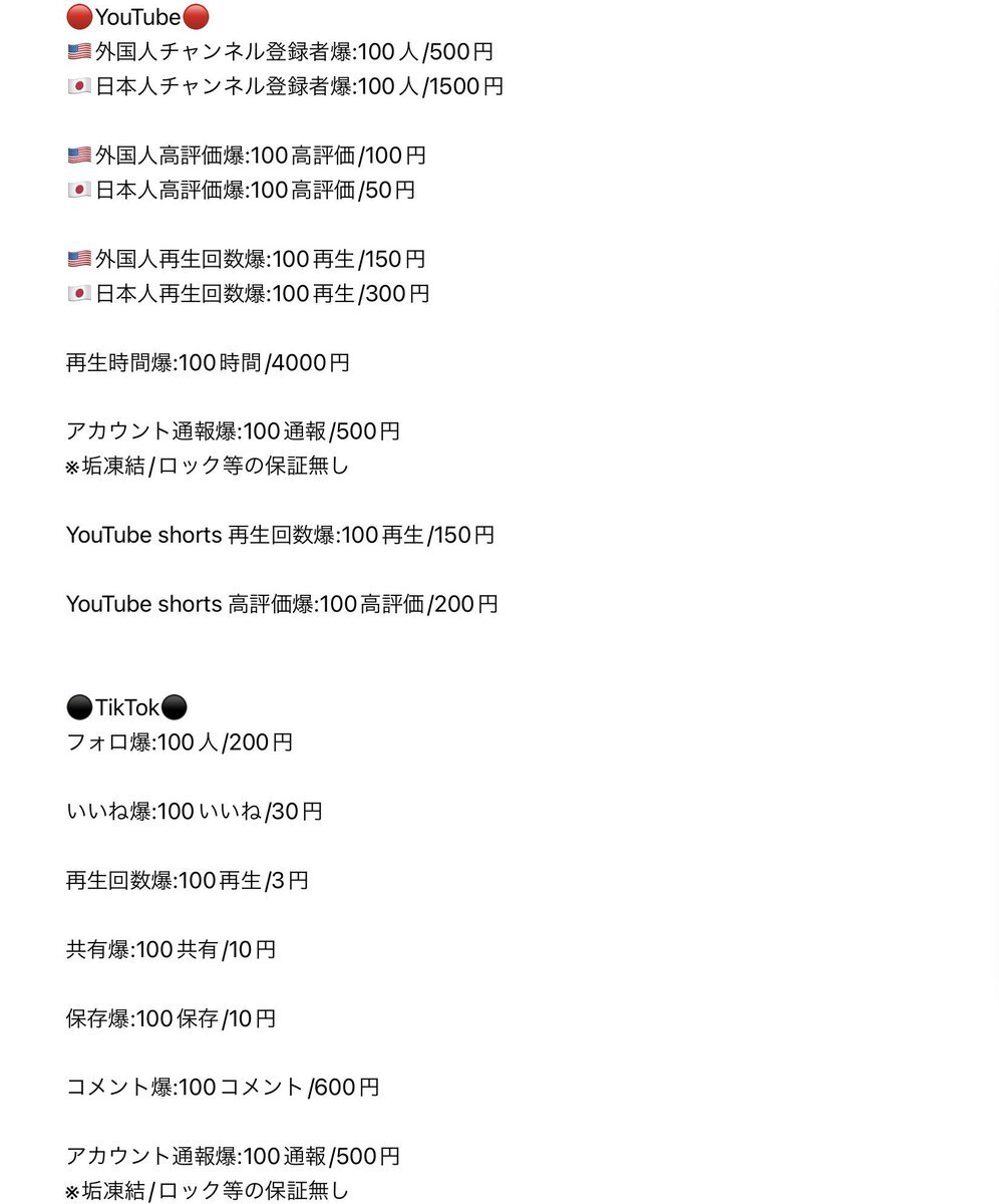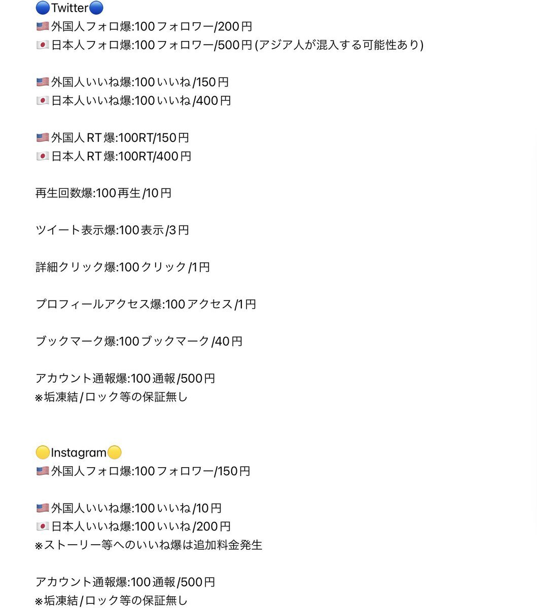 〜業者Z 料金表〜 🚨他業者より高い場合はお知らせください!値下げ致します🚨 Twitter/Instagram/YouTube/TikTokのフォロ爆、いいね爆、RT爆、再生回数爆等を界隈最安値の価格設定で承っております! お気軽にDMまでお問い合わせください✉ #フォロ爆 pic.x.com/Lqnio2wZez