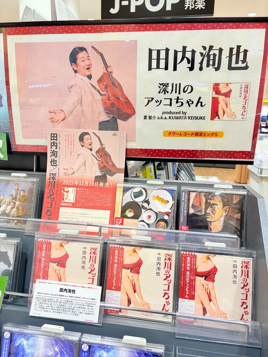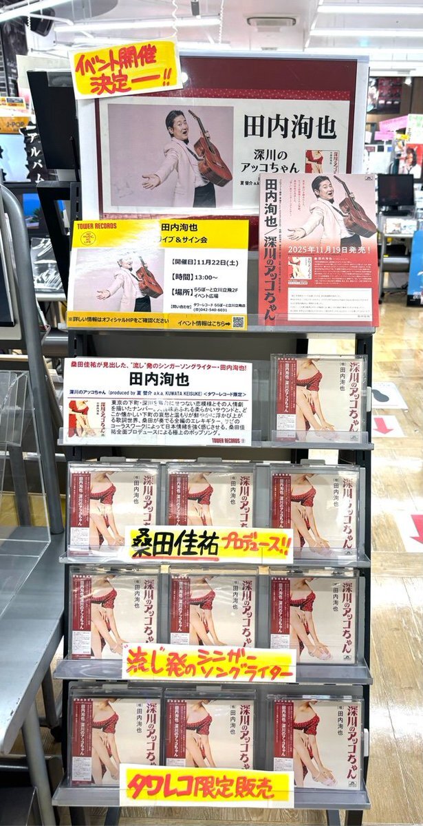 #田内洵也】  #桑田佳祐 さんが見出した"流し"発のシンガーソングライター✨ 『深川のアッコちゃん (produced by 夏 螢介 a.k.a. KUWATA KEISUKE)<タワーレコード限定>』 入荷しております👠 11月22日(土)にはイベント開催決定🌟 🔽詳細 tower.jp/store/event/20… #CD入荷情報 #フラゲ日 pic.x.com/9hw0aVPOSf