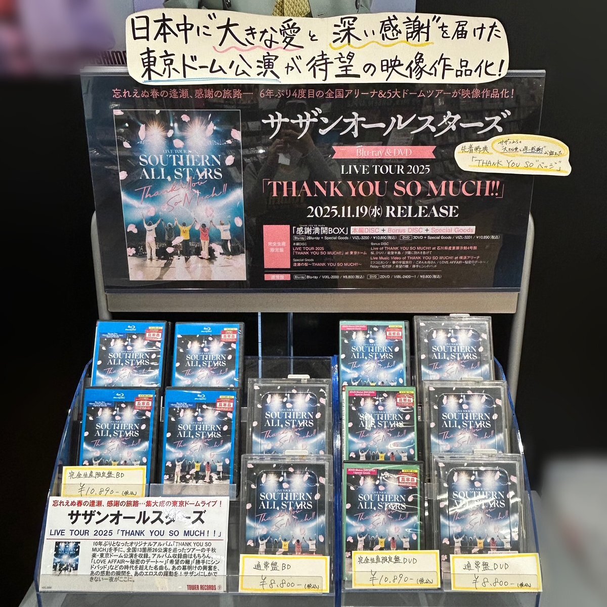 #サザンオールスターズ①】   サザンオールスターズ 『LIVE TOUR 2025 「THANK YOU SO MUCH!!」』 Blu-ray&DVD #フラゲ日🌸 エスカレーター正面にてドドンと大展開🙌 幕開けの興奮を!感動の瞬間を!! 是非ご自宅でもお楽しみください~🙆 そしてそして…! #サザン #THANKYOUSOMUCH pic.x.com/AgYPzPItc8